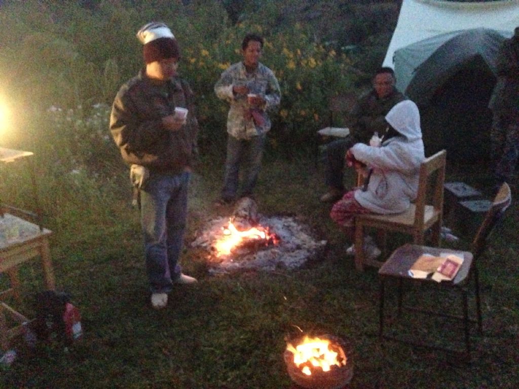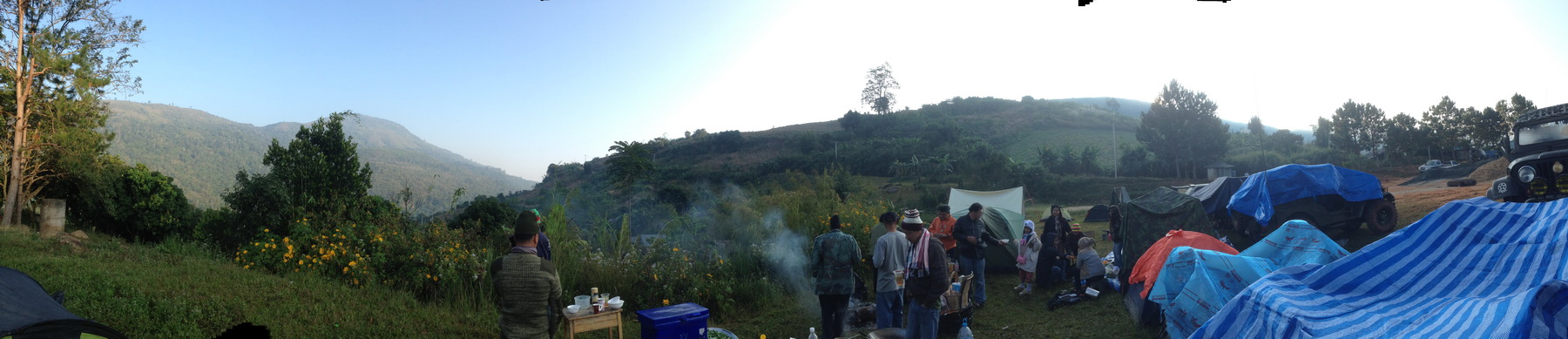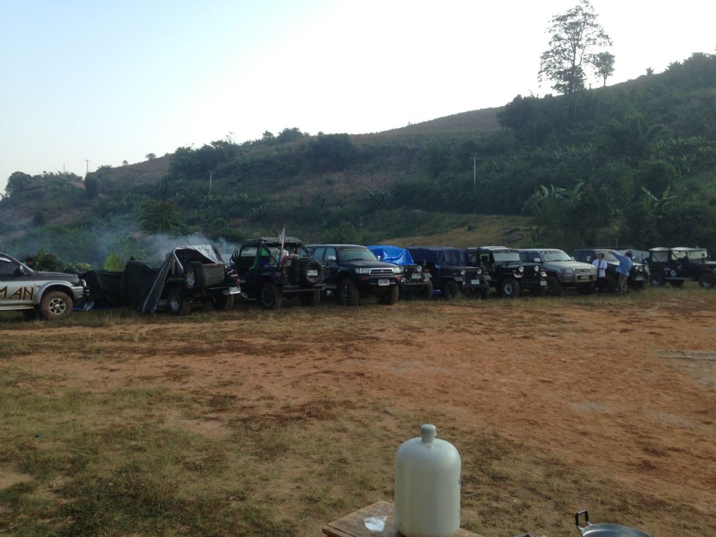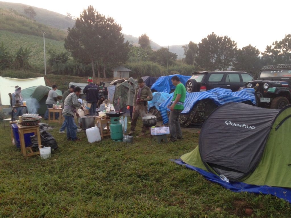 เป็นครั้งแรกที่ผู้ร่วมทริปนอนอยู่กลุ่มเดียวกัน ใช้รถปิดหน้า..เพราะคืนที่ผ่านมายอดเขาที่เป็นทางลงหมู่บ้าน ๔ องศา ส่วนที่หมู่บ้าน ต้อนเช้า ๑๐ แต่ตอนดึกซึ่งไม่มีใครตื่น น่าจะ ๘...