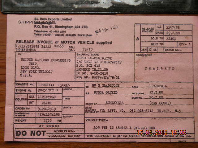 ณ ท่าเรือเมือง Liverpool ในวันหนึ่งของเดือนมีนาคม 1980 รถแลนด์รหัส LBCMH1AA 105569 เครื่องยนต์บล็อค 5 Mainshaft หมายเลขเครื่อง 90451787 E สี Limestone ผลิตจากโรงงานเมือง Birmingham คันดังกล่าว ถูกส่งขึ้นเรือ โดยสำนักงานสหประชาชาติ ส่งมายังประเทศไทย เข้าสังกัดกรมอนามัย กระทรวงสาธารณสุข ใช้ในโครงการคุมกำเหนิดในพื้นที่สูงจังหวัดอุตรดิถต์ ... 16 ปีต่อมา รถแลนด์โรเวอร์คันดังกล่าว ถูกปลดประจำการและประมูลออกมาในปี 2540 เจ้าของที่ประมูลได้ เก็บรักษาไว้เป็นอย่างดี ยังคงวิ่งได้ตามปกติ และยังไม่ได้นำไปจดทะเบียน เพราะคิดว่ารถคันนี้ น่าจะรอเจ้าของที่แท้จริง และชื่อของเขาคนนั้นจะเป็นชื่อลำดับที่สองในเล่มทะเบียน โดยเจ้าของลำดับที่หนึ่งคือ กรมอนามัย