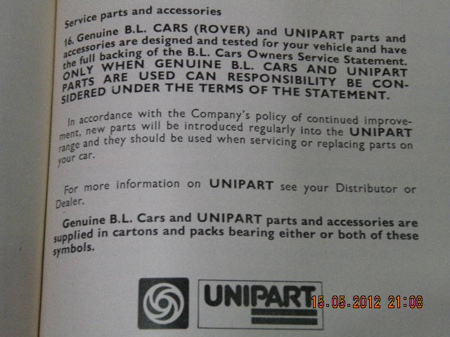 British Leyland ( B.L Cars) ได้ร่วมมือ และอนุญาติให้ UNIPART เป็นผู้ผลิต parts และ accessories ต่างๆ สำหรับการ servive และ maintenance รถ Landrover แก้ไขเมื่อ : 16/5/2555 9:04:44
