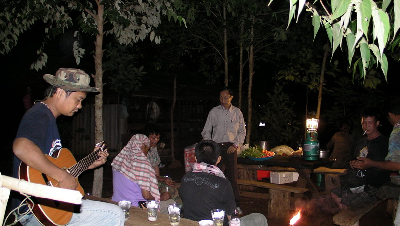 บรรยากาศเริ่มเย็นทุกคนเตรียมที่หลับที่นอน บ้างก็ทำกับข้าว บ้างก็ดื่ม เล่าเรื่องสนุกสนาน ท่านสุรินก็บรรยายความเป็นมา พื้นที่ท่องเที่ยวซึ่งเราอยากไปให้หมดแต่คงติดที่เวลาและแรงกายที่อ่อนแอ ท่านสุรินบอกว่ายินดีต้อนรับลูกเขยไทยแต่ต้องเอาจริงๆนะจะได้มาพัฒนาช่วยกัน