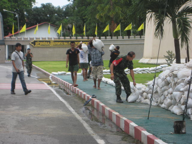 พี่ๆ ทหารกำลังรีบเร่งขนกระสอบทราย บริเวณหน้าวิหารหลวงพ่อพระพุทธชินราช
