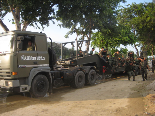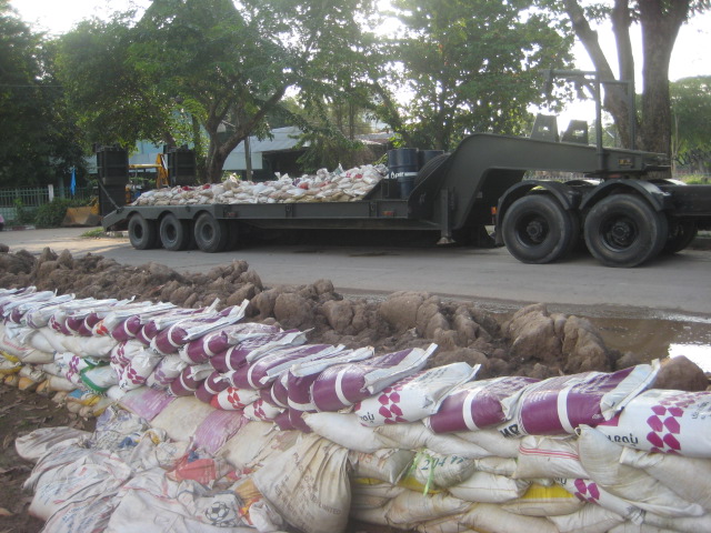 นำรถเทนเลอร์ขนาดใหญ่จำจวนหลายคัน บรรทุกกระสอบทรายทั้งเมืองลงไปช่วยเหลือพี่น้อง