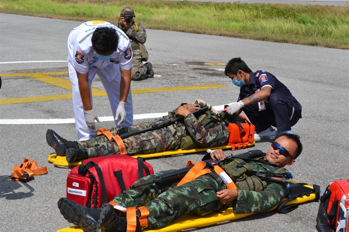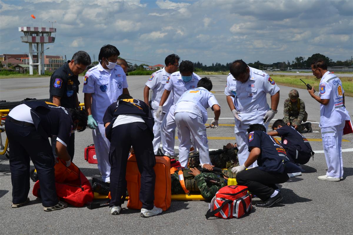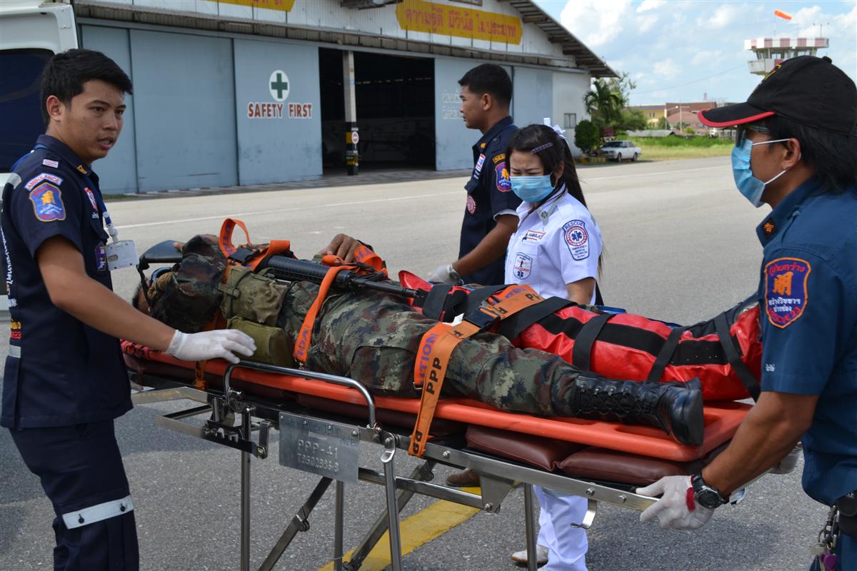 ก็เริ่มแผนฝึกช่วยเหลือ และ ลำเลียงผู้บาดเจ็บลงจากเครื่อง