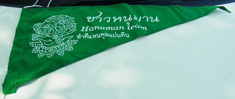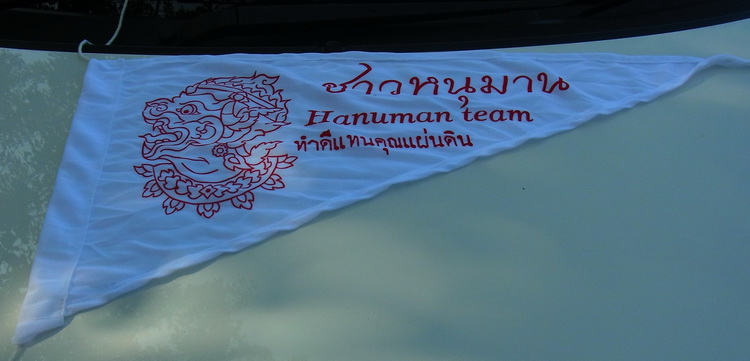 แบบธงติดรถยนต์ของ ชาวหนุมาน มีสองสี เขียว และขาว ชาวหนุมานรับได้ก่อนกรีฑาทัพขึ้น เขาค้อ