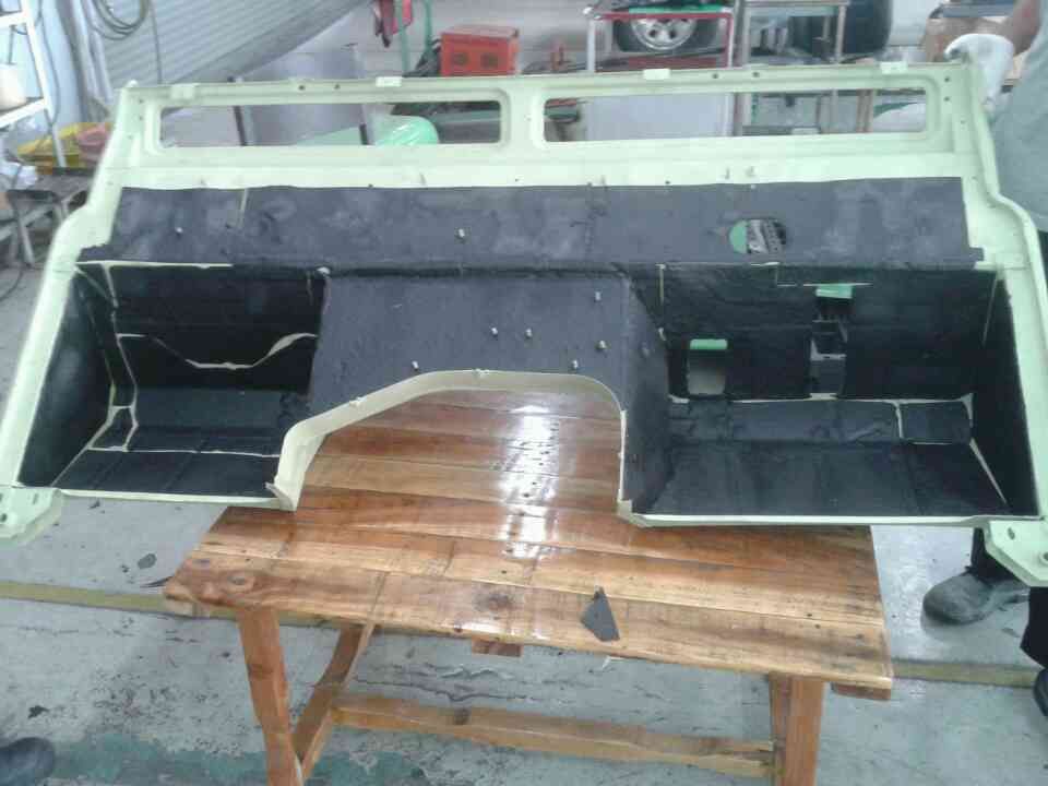 ติดแผ่นยางมะตอย ด้านในให้ครบฯ เพื่อลดเสียง และ ความร้อน จากห้องเครื่องเข้ามาด้านใน เพราะว่ามีประสบการณ์จากอดีตเมื่อใช้รถแบบเดิมฯที่ไม่มีการกรุป้องกันอะไรเลย เมื่อขับทางยาวสิ่งที่รบกวนมากที่สุดคือเสียงและความร้อนครับในระหว่างนี้มีโอกาสต้องทำครับเพราะว่าถ้าหากประกอบเป็นคันรถแล้วจะมากรุทีหลัง ยากมากฯครับ