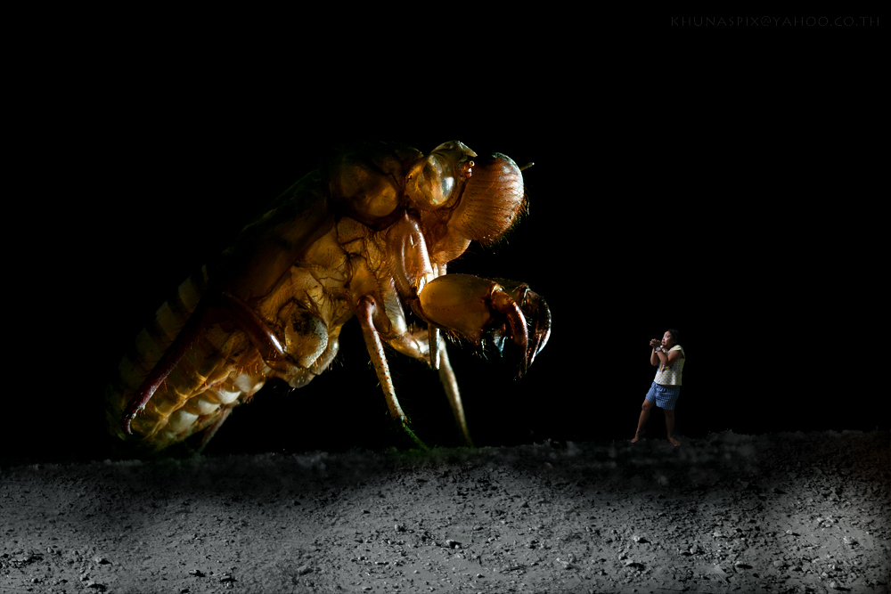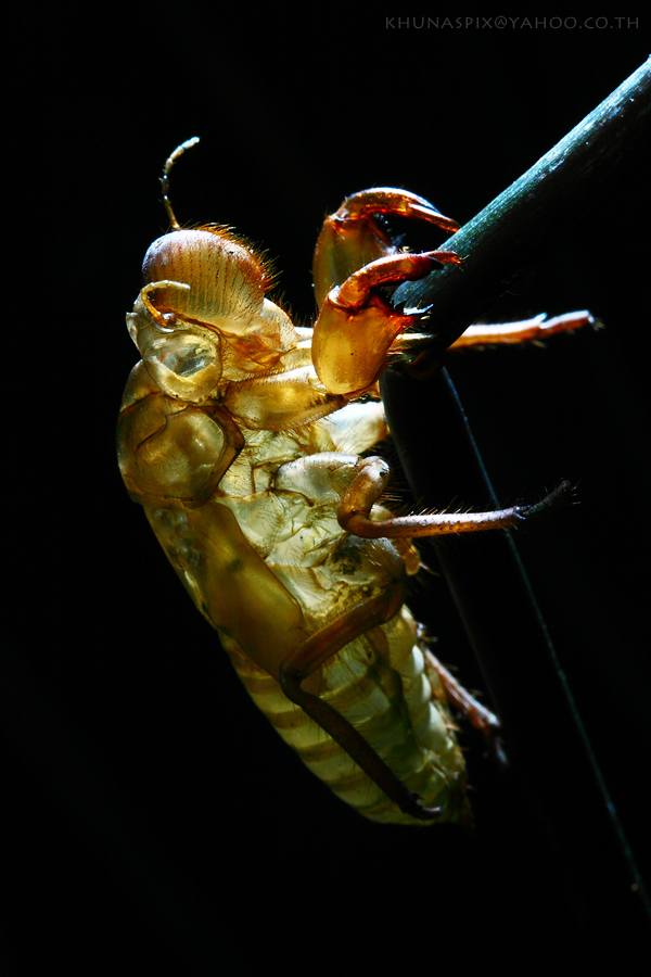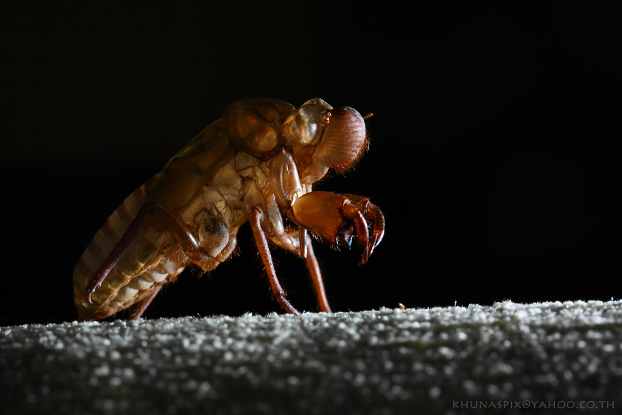 ที่เล่ามาทั้งหมดจะบอกว่าหลังจากดูหนังจบแล้วก็เลยคันมากๆ เพราะเห็นสัตว์ในหนังหน้าตาแปลกๆสีสวยๆเยอะเลย...ก็เลยมีแรงประกอบกล้องเข้ากับเลนส์มาโครออกไปหาอะไรถ่ายที่หน้าบ้านกับลูกสาว....ไปเจอเอาเปลือกจั๊กจั่นลอกคราบเข้าก็เลยบอกให้ลูกสาวหยิบมาถ่ายภาพเล่นกันดีกว่า...