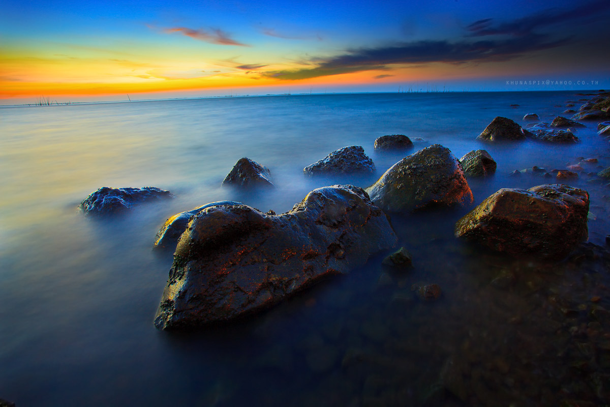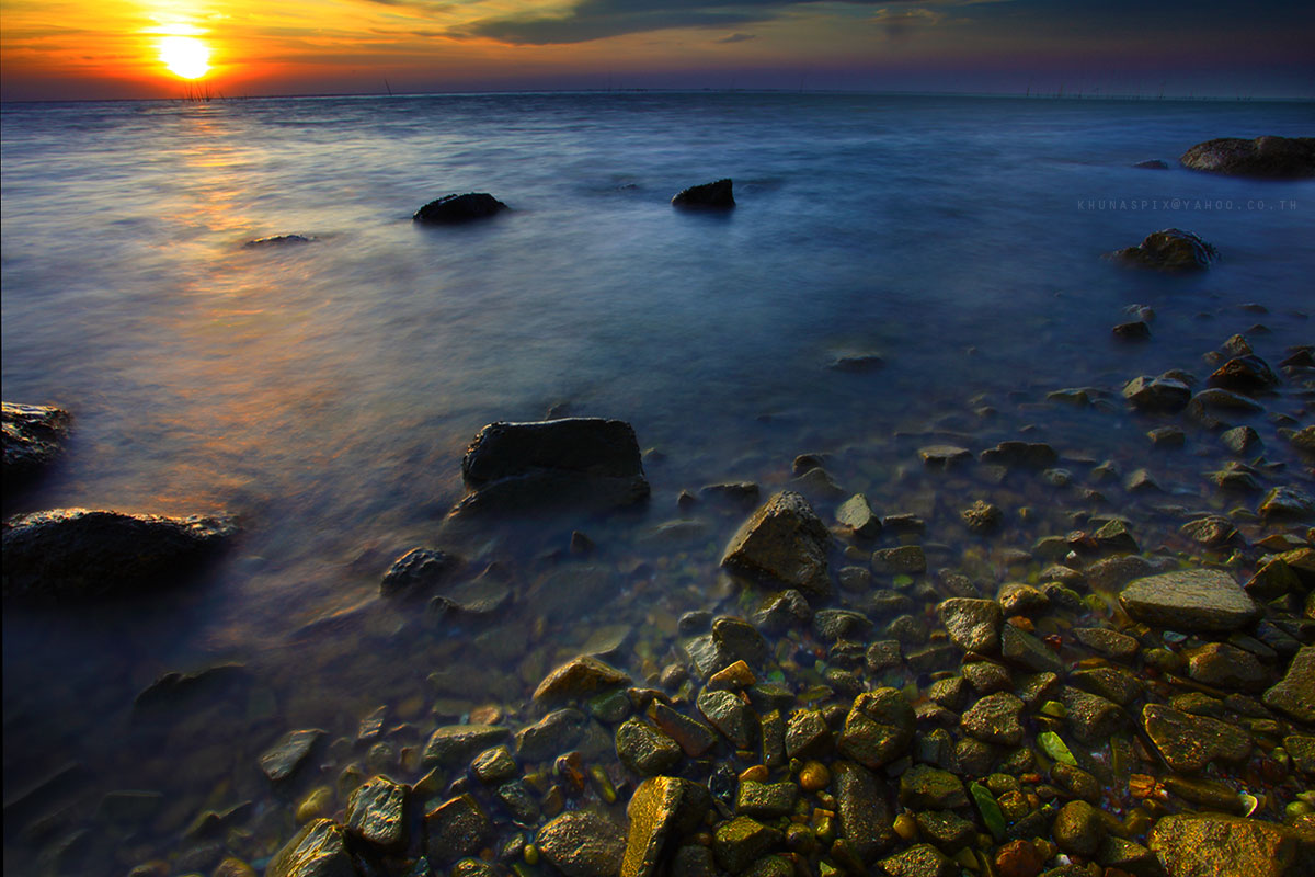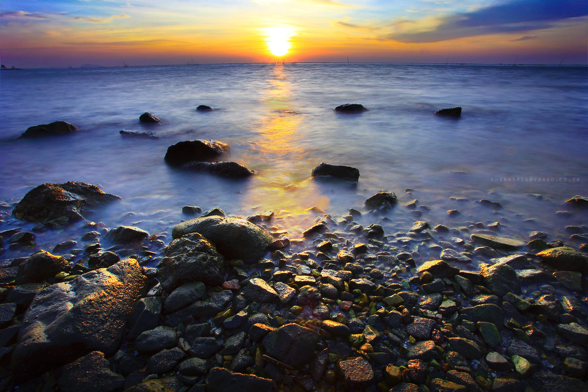 เพลินๆ แป๊บเดียวก็ได้เวลานาทีทองแล้ว... ภาพนี้ถ่ายคร่อม 3 ค่าแสง แล้วเอามาผสานกันด้วย photoshop ตรงนี้หินลื่นมากๆ ไม่อย่างนั้น ผมคงได้ภาพ self portrait ไปเก็บไว้ในคอลเลคชั่นอีกเป็นแน่...อยากไปยืนเหม่อมองพระอาทิตย์ที่ปลายหินมุมบนขวา....