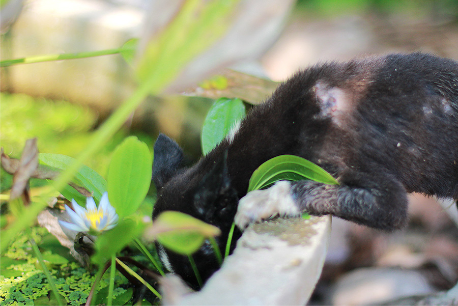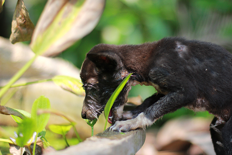 แล้วก็เหลือบไปเห็นเจ้านี่... ใจผมคิดว่า น้องหมาตัวนี้พยายามฆ่าตัวตายอยู่ เกิดมามีกรรมโรคภัยเบียดเบียน เลยเอาหน้ามุดน้ำฆ่าตัวตาย