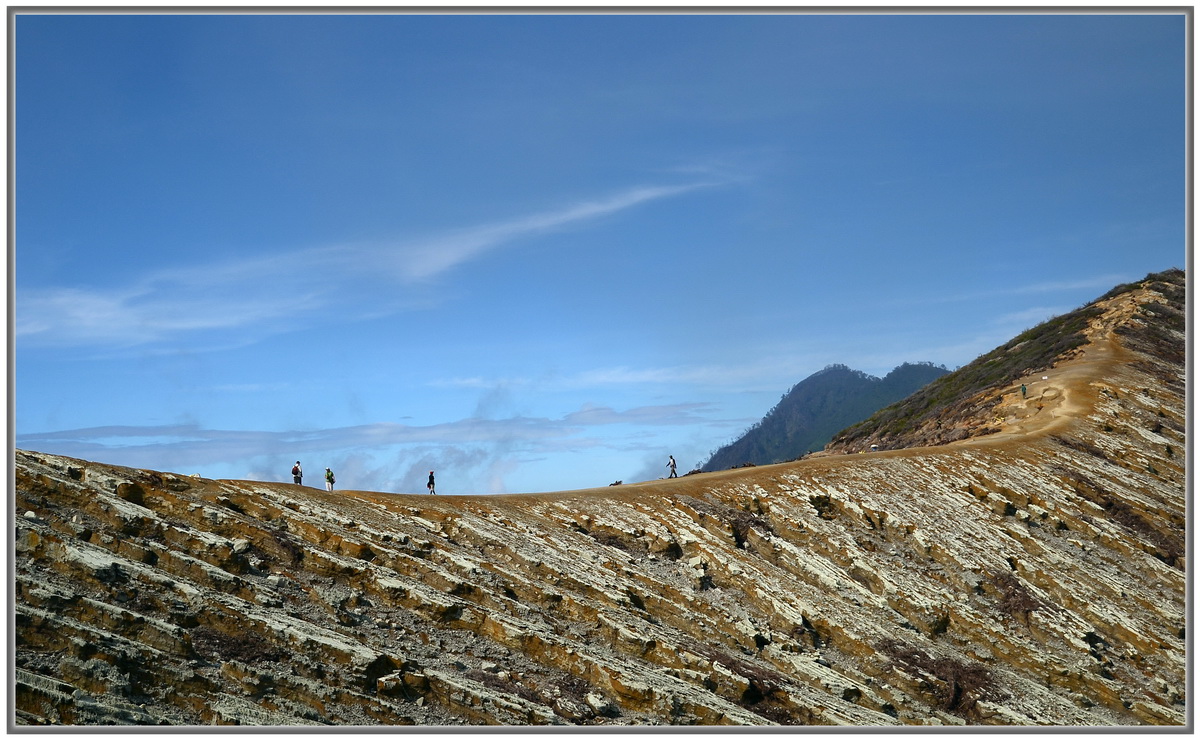 ระหว่างเดิน ก็จะสวนกับชาวบ้านที่หาบกำมะถัน ลงจากยอดเขาตลอดเวลา (ข้างบนเป็นเหมืองกำมะถัน) น้ำหนักที่หาบ ประมาณ 60-70 กก.