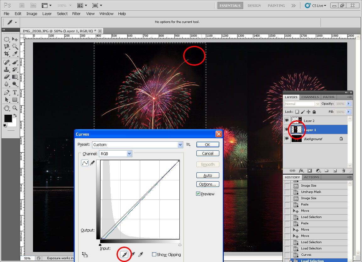 ทั้ง 2 layer ของพลุที่นำเข้ามา เลือก Curve (Ctrl+m) แล้วไปที่เครื่องดูดสี (อันที่เป็นสีทืบ เพราะจะเป็นค่าสีดำ) ไปดูในส่วนท้องฟ้าสีดำ