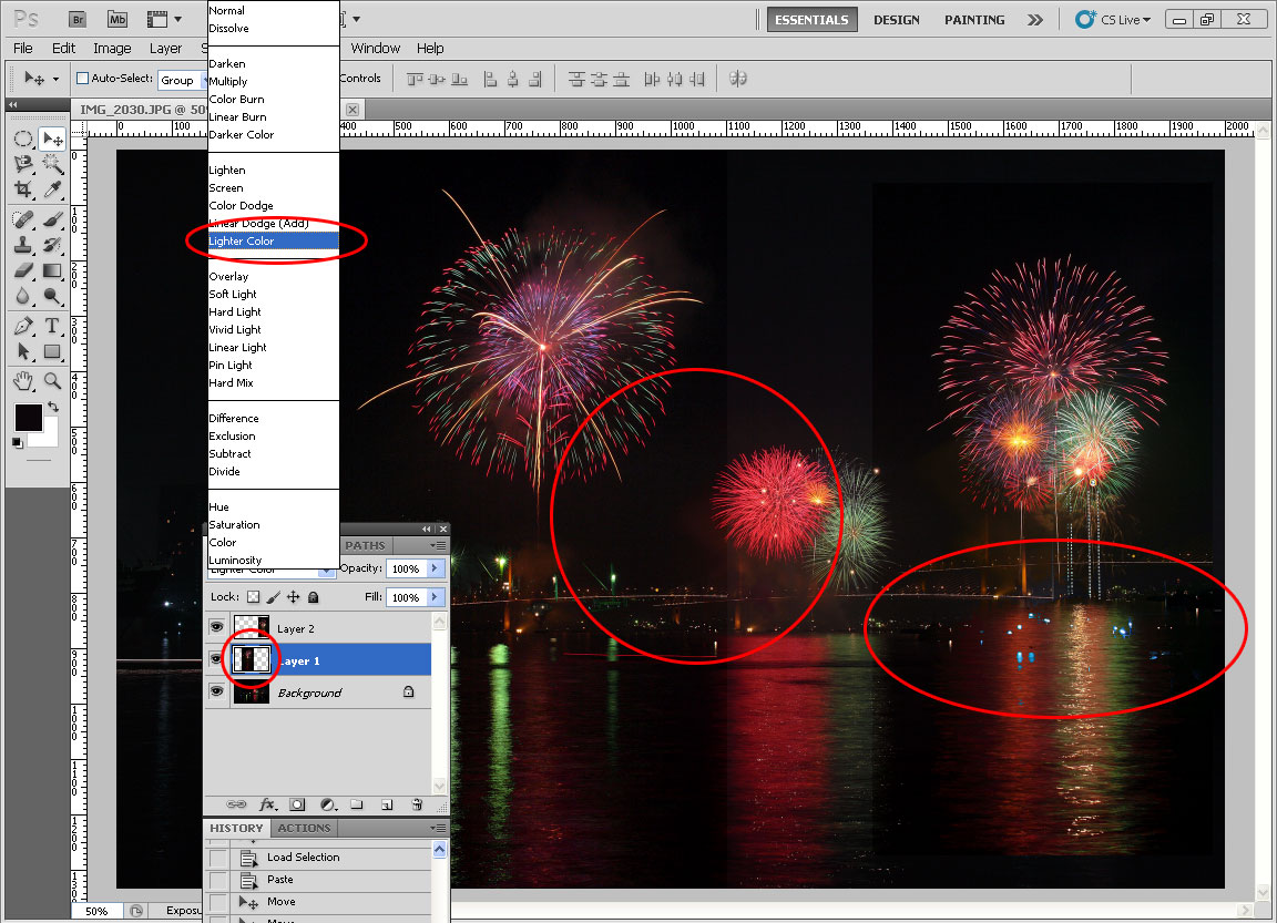 ไปที่ Layer ของพลุที่นำเข้ามา ตั้งให้เป็น Lighter Color ของพลุทั้ง 2 ดอก พอเลือกเสร็จจะเห็นว่าเริ่มดูเนียนขึ้นแล้วครับ