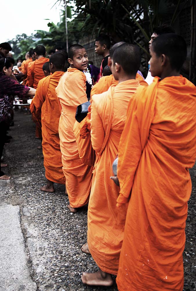 ผู้คนเข้าแถวตักบาตร พระอวุโสเดินนำเณรน้อยเดินตาม กว่าจะถึงเณรโยมก็ไม่มีข้าวจะตักให้แล้ว