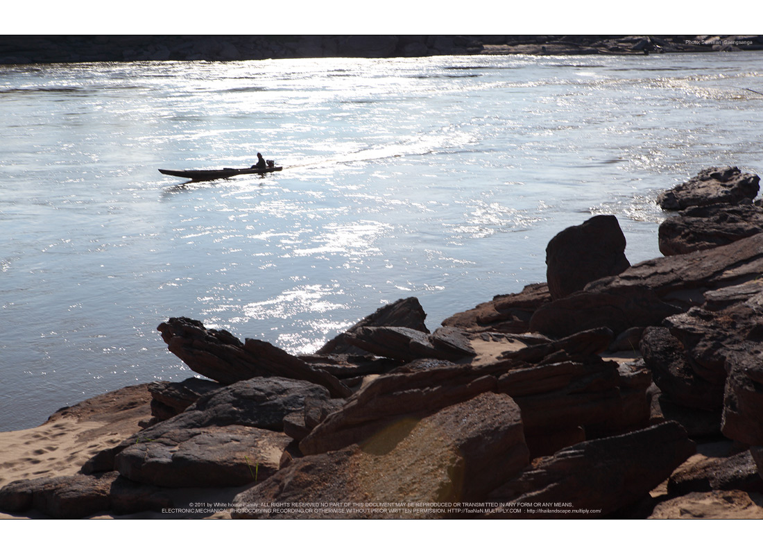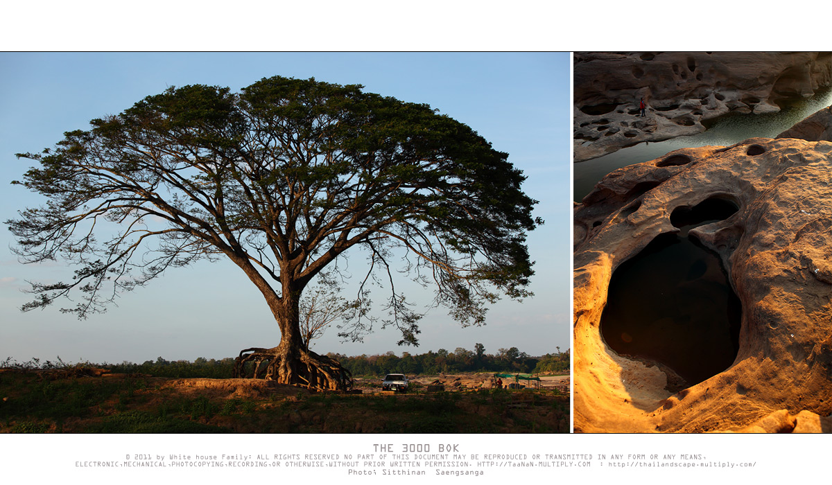สาระ....แก่งหินสามพันโบก เป็นกลุ่มหินทรายแนวเทือกเขาภูพานตอนปลายที่ทอดตัวยาวริมฝั่งโขงไทยและลาว สายน้ำแคบและเป็นคุ้งน้ำ ณ เส้นรุ้งที่ N.15 องศา 47.472 ลิปดา และเส้นแวงที่ E.105 องศา 23.983 ลิปดา ริมฝั่งโขงบริเวณนี้เป็นกลุ่มหินที่เรียงตัวทอดยาว เป็นสันดอนขนาดใหญ่พื้นที่กว่า 30 ตารางกิโลเมตร ผาหินบริเวณโค้งด้านหน้ารับแรงน้ำที่ไหลจากตอนบน ก่อเกิดประติมากรรมธรรมชาติที่งดงาม