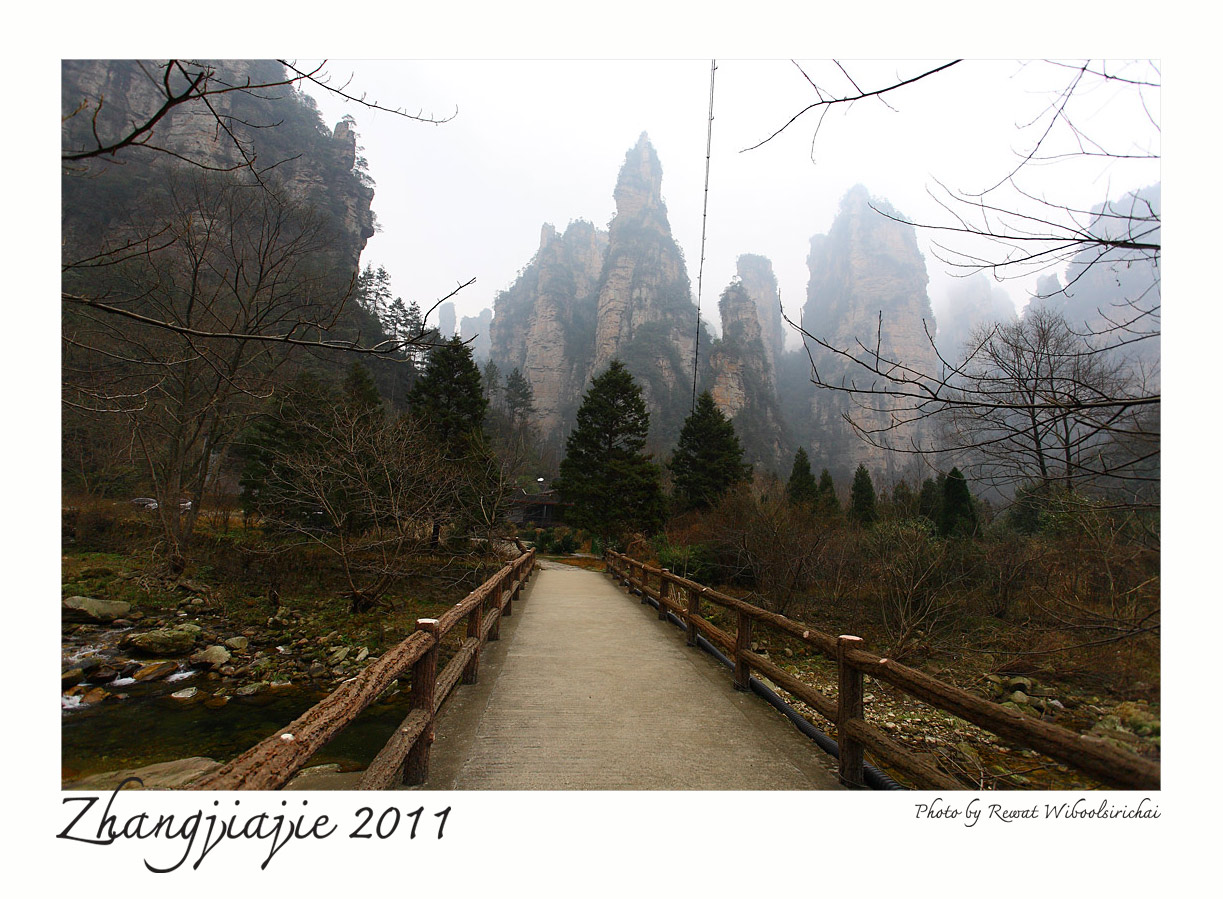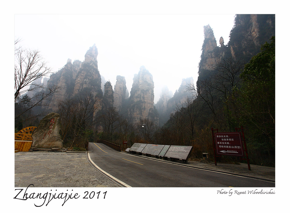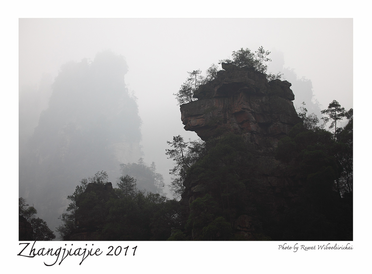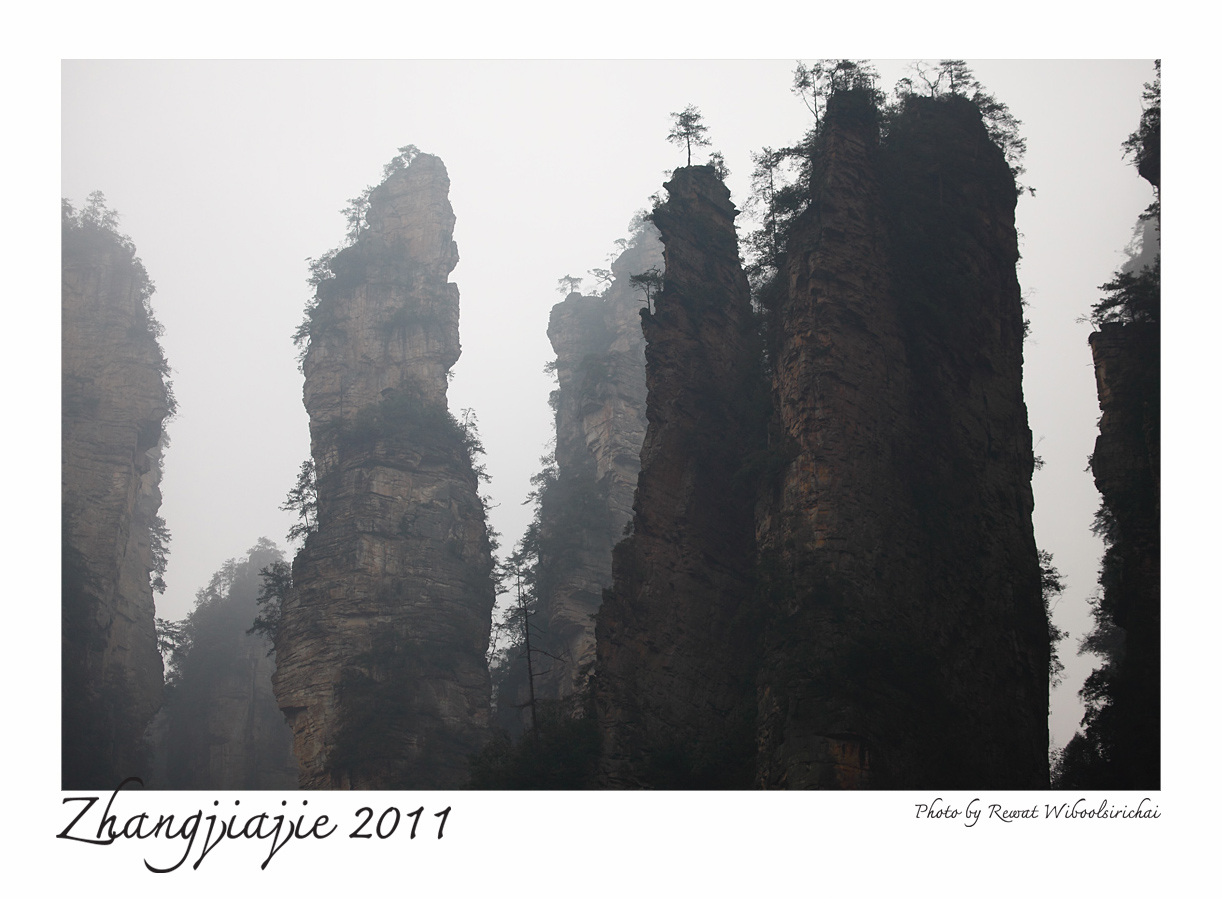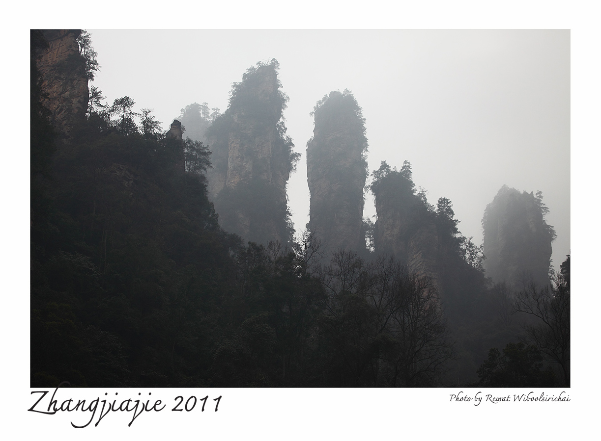 จากนั้นขึ้นไปบนยอดเขาด้วยลิฟท์แก้วไป่หลง สูง 326 เมตร ภาพนี้ถ่ายจากในลิฟท์