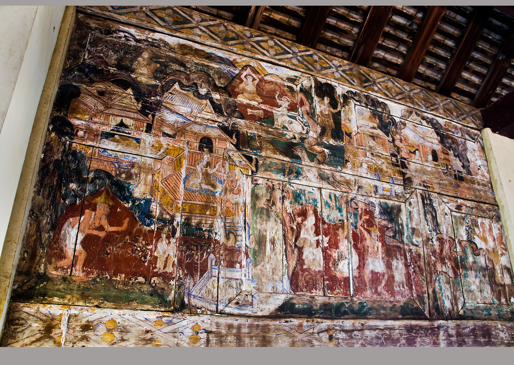 กำแพงด้านพระประธานเขียนภาพลายทองบนพื้นรักแดง มีภาพจิตรกรรมศิลปะล้านนาบนแผงไม้คอสองที่กล่าวกันว่าเก่าแก่ที่สุด และหลงเหลือเพียงแห่งเดียวในเมืองไทย อายุราวพุทธศตวรรษที่ 21 ลงมา แต่ปัจจุบันภาพเขียนลบเลือนไปมาก