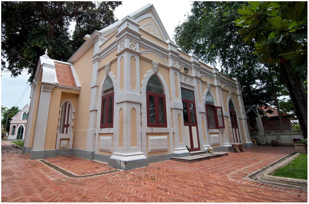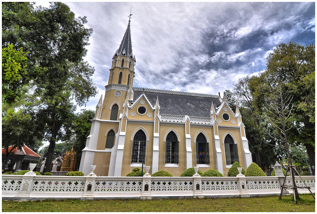 วัดนิเวศธรรมประวัติ ...พระบาทสมเด็จพระจุลจอมเกล้าเจ้าอยู่หัว โปรดให้สร้างเลียนแบบโบสถ์ฝรั่ง เมื่อ พ.ศ. 2421 อาคารและการตกแต่งทำแบบโกธิค มีกระจกสีประดับอย่างสวยงาม
