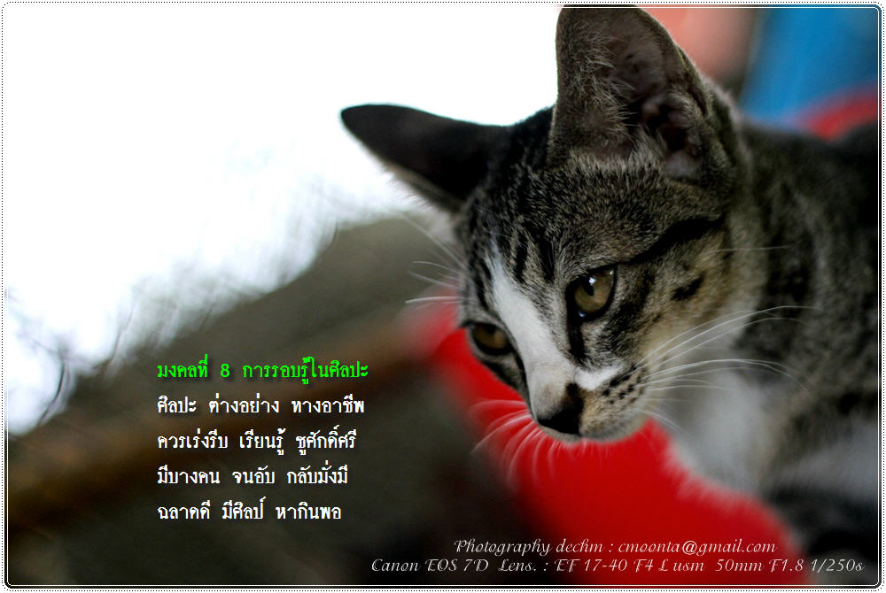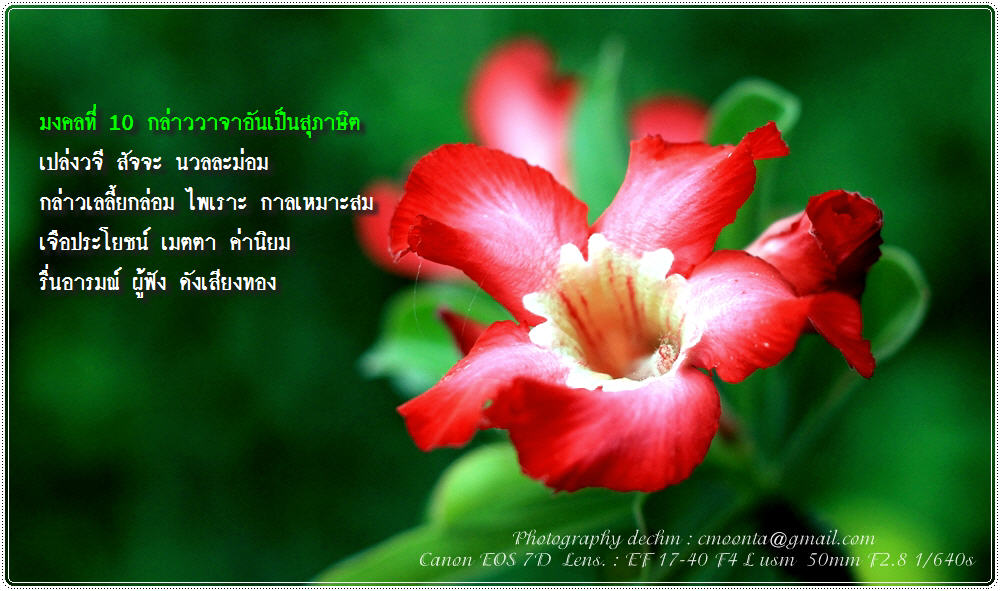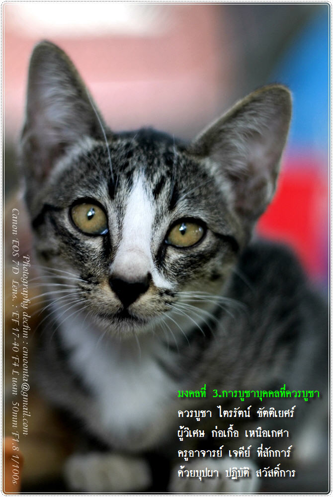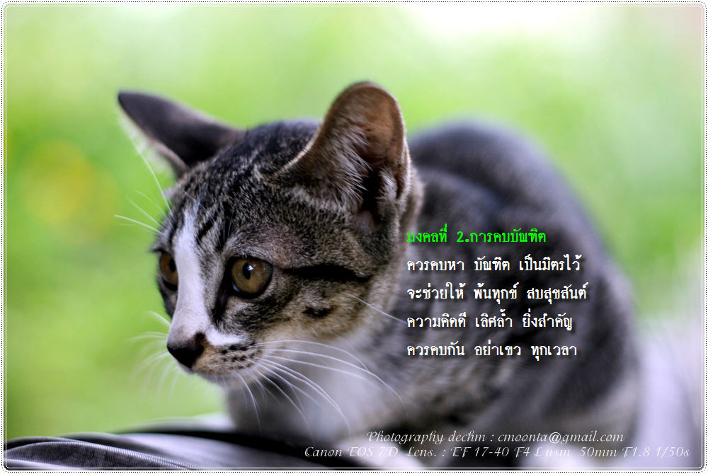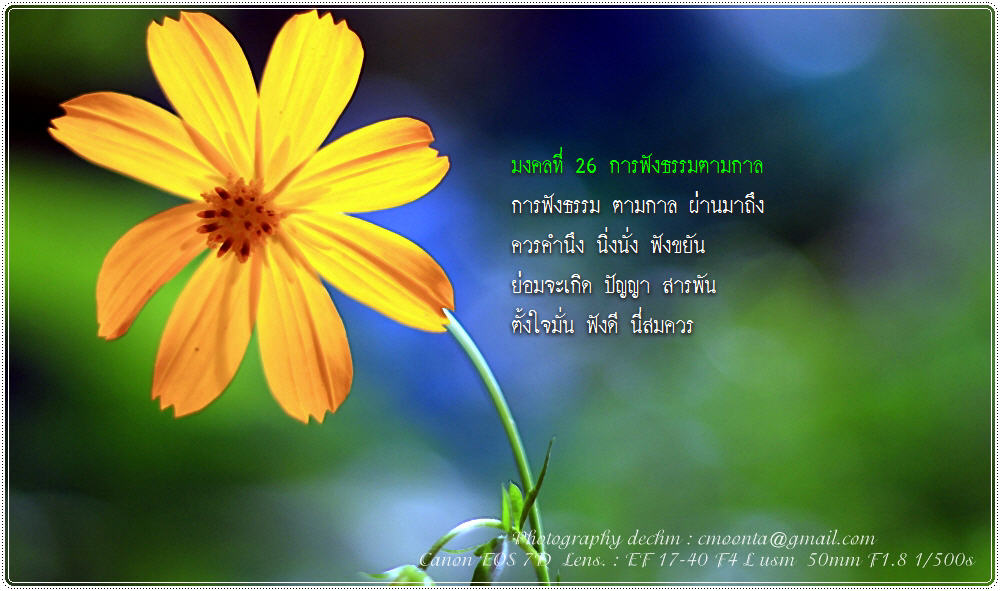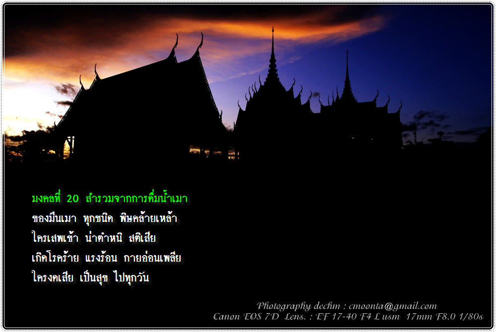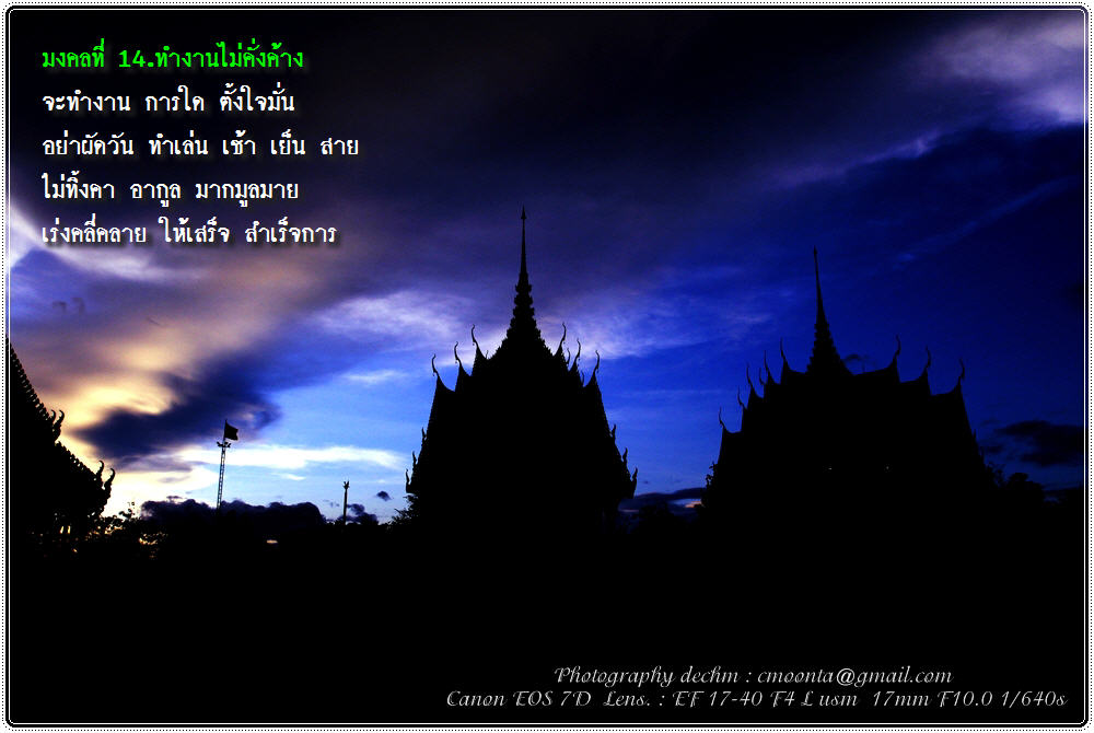 คำคม : คงไม่มีคำคมใดที่มีคุณค่าไปกว่าคำสอนขององค์สมเด็จพระสัมมาสัมพุทธเจ้า ที่มีเทวดามาถามคำถามว่า "คุณธรรมอันใดที่ทำให้ชีวิตประสบความเจริญ" อันเป็นที่มาของ "มงคลชีวิต 38 ประการ" ที่ใครปฏิบัติตามย่อมเป็นเหตุนำมาซึ่งความสุข ความเจริญก้าวหน้าในชีวิต