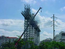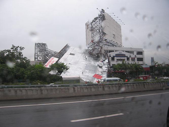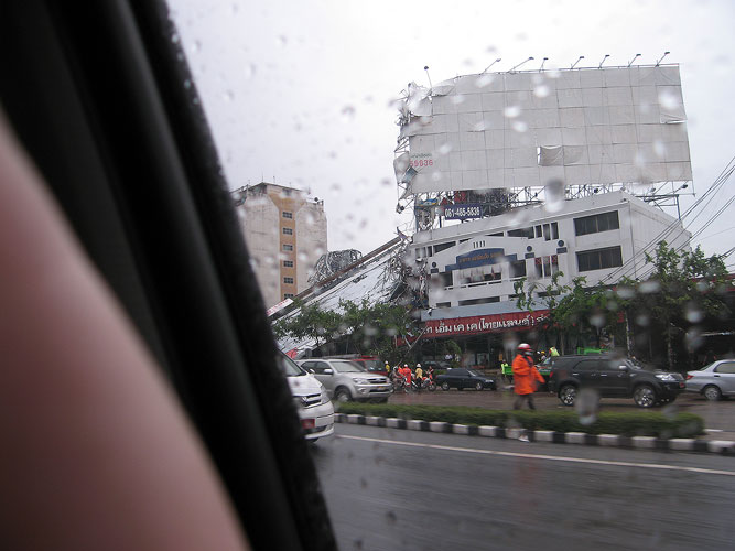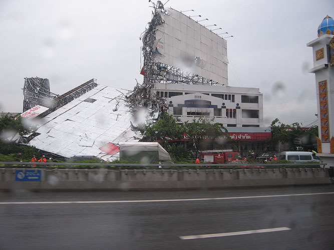 วันที่ 26 มิถุนายน 2545 เกิดเหตุป้ายโฆษณาขนาดใหญ่ สูง 47 เมตร ยาว 82 เมตร บริเวณตลาดสด บางนา หักโค่นลงมาทับอาคารบ้านเรือนในขณะที่เกิดพายุฝน จนเป็นเหตุให้เด็กหญิงวัย 7 ขวบ คนหนึ่งได้รับบาดเจ็บสาหัสและเสียชีวิตในเวลาต่อมา ซึ่งต่อมาภายหลังได้มีการสอบสวนจนทราบ ว่าป้ายดังกล่าวก่อสร้างผิดไปจากแบบที่ได้ยื่นขออนุญาตจากทาง กทม. โดยในแบบที่ได้ขออนุญาต ไว้นั้นเป็นป้ายขนาด 22x31.5 เมตร จำนวน 2 ป้าย ห่างกัน 4 เมตร วางอยู่บนดิน ตัวโครงเหล็ก ยึดกันด้วยวิธีการเชื่อม แต่การก่อสร้างจริง ป้ายดังกล่าวมีขนาด 42x82 เมตร ตัวโครงเหล็ก ยึดกันด้วยวิธีใช้น๊อตขัน ดังนั้นเจ้าพนักงานสอบสวนจึงตั้งข้อหากับสถาปนิกและวิศวกรผู้ออก แบบและวิศวกรผู้ควบคุมการก่อสร้างว่าไม่ปฏิบัติตามหลักเกณฑ์ที่พึงกระทำ และกระทำการโดยประ มาทจนเป็นเหตุให้ผู้อื่นเสียชีวิต ซึ่งผลสรุปของกรณีนี้ลงเอยด้วยการที่ วิศวกรผู้ออกแบบถูก ลงโทษตักเตือนและยกข้อกล่าวหาวิศวกรผู้ควบคุมงาน