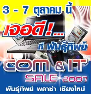 ศูนย์การค้าพันธุ์ทิพย์ พลาซ่า เชียงใหม่ เตรียมพร้อมการจัดงาน PANTIP COM & IT SALE 2007 part II แน่นขนัดด้วยสินค้าเกรดเอ จากแบรนด์ดัง สินค้าคุณภาพบริการเป็นเลิศ จากร้านค้าท้องถิ่น โปรโมชั่นสุดฮ็อต ทั้งการประมูลสินค้าไอทีราคาเริ่มต้นเพียง 1 บาท , ลุ้นซื้อสินค้าไอทีราคาตั้งแต่ 9 บาทขึ้นไป และกิจกรรมสนุกทุกวันตลอดรายการ 3 7 ตุลาคม นี้ เพียง 5 วันกับโอกาสดี ๆ ที่คุณไม่ควรพลาด