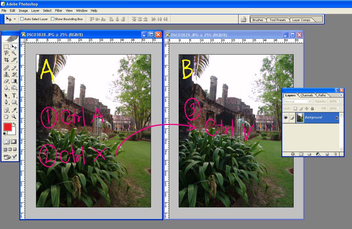 Ctrl A,(1) Ctrl X,(2) แล้วคลิกภาพ B ใช้คำสั่ง Ctrl V(3)