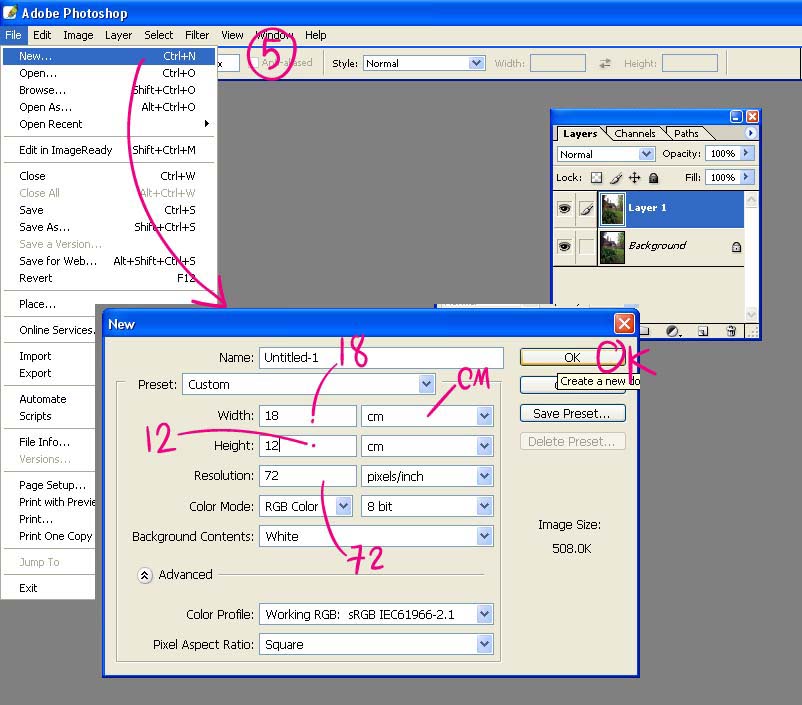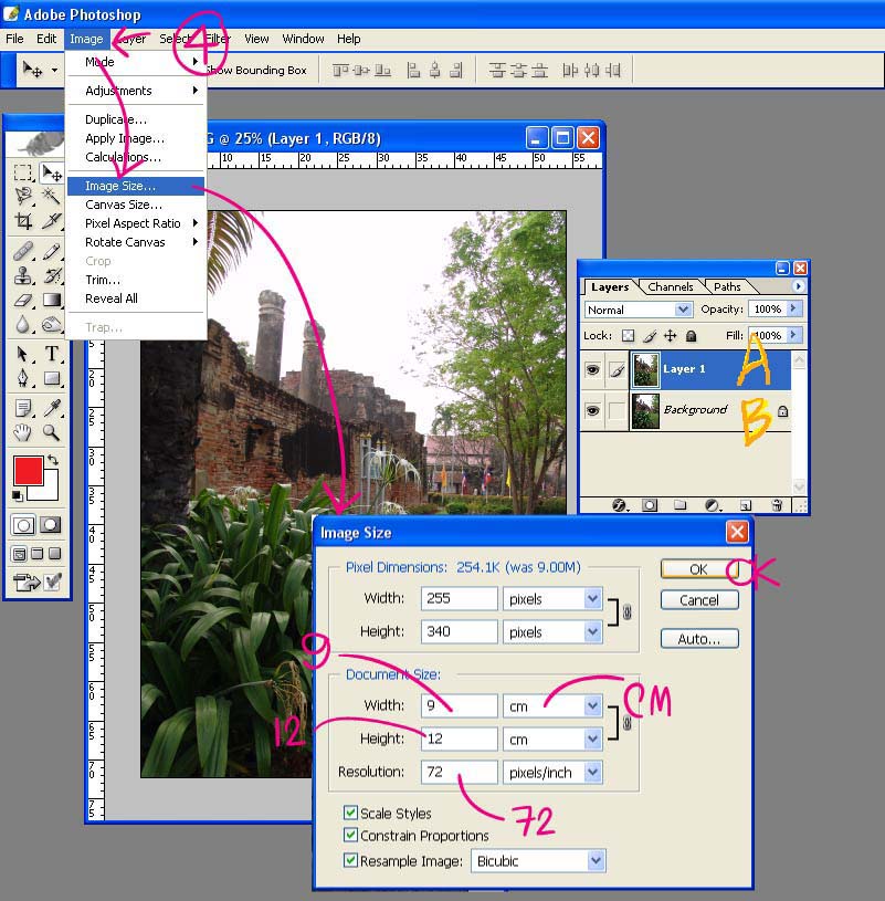 ขั้นตอนที่ 5. กลับไปที่ภาพ A และ B (8) คลิกปุ่มซ้ายที่หน้าต่างเลเยอร์ คือภาพ A (9) ค้างไว้แล้วลากเมาส์พร้อมเลเยอร์นั้นข้ามไปยังในกรอบหน้างานที่เตรียมไว้ โดยวางภาพนั้นไว้ทางด้านซ้ายของหน้างาน จัดให้ชิดเส้นไม้บรรทัด (ตอนนี้คำสั่ง Snap to Guides ที่สั่งไว้จะช่วยให้สะดวกขึ้น) จากนั้นก็กลับไปที่ภาพ A และ B อีกครั้งคลิกเลเยอร์ที่ 2 (10) คือภาพ B แล้วลากมาที่หน้างานจัดชิดเส้นให้ติดกับภาพ A