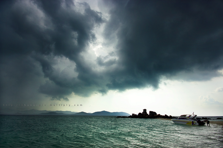 คำตอบที่ 2 แล้วฝนก็ไล่หลังมาจนทัน...เรือที่นั่งไปเลยต้องไปจอดหลบฝนที่หาดไข่นอกก่อน...เพื่อรอลมฝนสงบ....