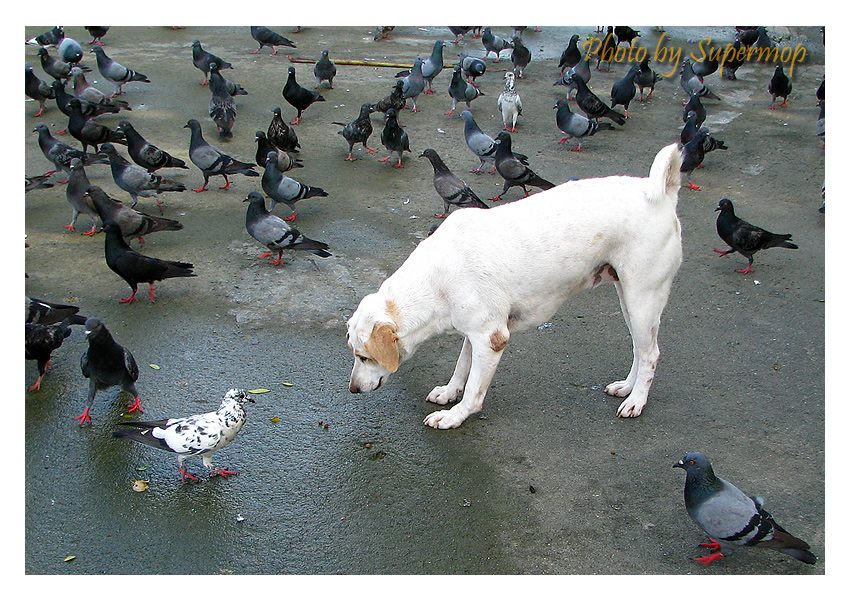 คำตอบที่ 25 ขำภาพนี้ดีครับ คิดได้สองแบบ คืออาหารอยู่ตรงกลาง แล้วนกแย่งหมา หรือหมาแย่งนกกันแน่