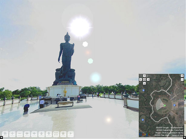 คำตอบที่ 17 มาดูประโยชน์ในการนำภาพพานอรามาแบบนี้หลายภาพมา ลิ๊งค์กันไปมาประกอบบนแผนที่ดาวเทียม เป็นการขยายมุมมองภูมิทัศน์ของสถานที่ได้กว้างขึ้น สามารถเข้าใจภาพที่เห็นในแบบภาพรวมได้ว่า ภูมิประเทศต่างๆเช่น ถนนเส้นที่เห็นจะพาไปที่ใด บึงน้ำที่เห็นกว้างขวางแค่ไหน หรือข้างหลังต้นไม้พุ่มไม้ที่เห็นมีอะไรอยู่ ฯลฯ ส่วนใหญ่ฝรั่งใช้เทคนิคนี้ในการแนะนำสถานที่่ท่องเที่ยว ลองดูตัวอย่างที่นี่ครับ http://www.thaipano.com/puttamonthon/ ภาพ ชุดนี้ถ่ายมาด้วยความละเอียดของภาพน้อยไปหน่อย และไม่ได้ใช้ขาตั้งกล้องเลยทำให้บางภาพต่อกันไม่ค่อยสนิท ดูเทคนิคการนำเสนอแทนแล้วกัน ส่วนวิธีสร้างใช้ความรู้ของการเขียนโปรแกรมเป็นส่วนใหญ่ ใช้เวลาทำมากพอสมควร ไม่สามารถแนะนำวิธีทำที่นี่ได้ครับ