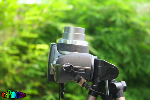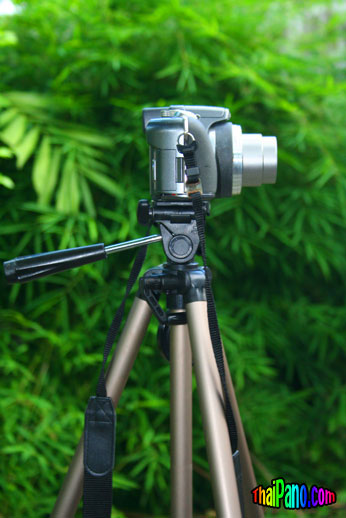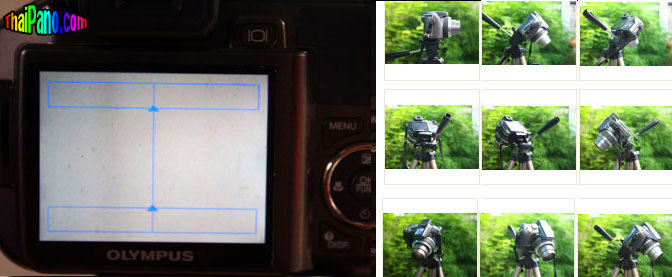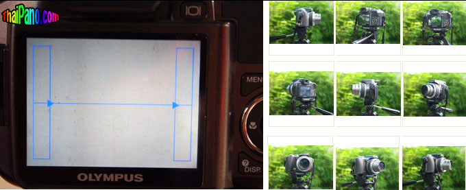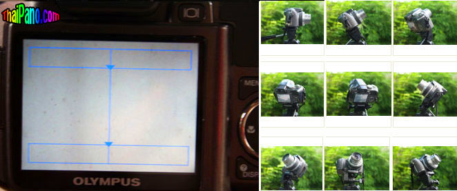 คำตอบที่ 2 ขั้นตอนแรก 1. ติดตั้งกล้องไว้บนขาตั้ง แล้ววางในพื้นที่ๆจะถ่ายภาพ พยายามปรับขาตั้งให้กล้องอยู่ในแนวระนาบมากที่สุด เมื่อหมุนกล้องรอบตัวครบรอบ 360 องศา ภาพต้องอยู่ในแนวระดับเดียวกัน 2. ปรับ กล้องให้อยู่ในโหมดการถ่ายภาพวิว ปรับการซุมของกล้องให้อยู่ในตำแหน่งมุมกว้างที่สุด (ซูมขยายภาพน้อยที่สุด) ถ้าเป็นไปได้ปรับโฟกัสของกล้องให้เป็น infinity หันหน้าเลนส์ไปยังจุดเริ่มต้นการถ่ายภาพแรก แล้วจำตำแหน่งนี้ไว้ เริ่มต้นกดปุ่มชัตเตอร์เพื่อถ่ายภาพแรก 3. เปิดจอ LCD หลังกล้อง ดูภาพเฉพาะที่มุมด้านซ้ายหรือขวาด้านใดด้านหนึ่งของจอ LCD ในพื้นที่ประมาณประมาณ 1 ใน 5 ของจอ หมุนกล้องบนขาตั้งไปทางด้านที่มองอยู่นั้นจนภาพ 1/5 ของจอนั้นย้ายไปอยู่อีกด้านหนึ่ง กดปุ่มชัตเตอร์เพื่อถ่ายภาพอีกครั้งหนึ่ง แล้วทำซ้ำตามขั้นตอนนี้จนหมุนกล้องกลับมาอยู่ที่ตำแหน่งแรก
