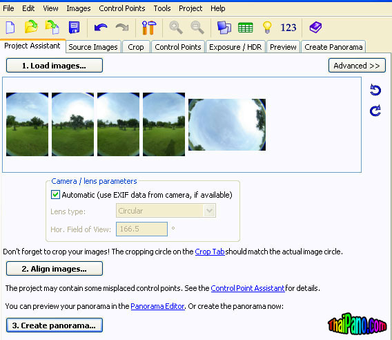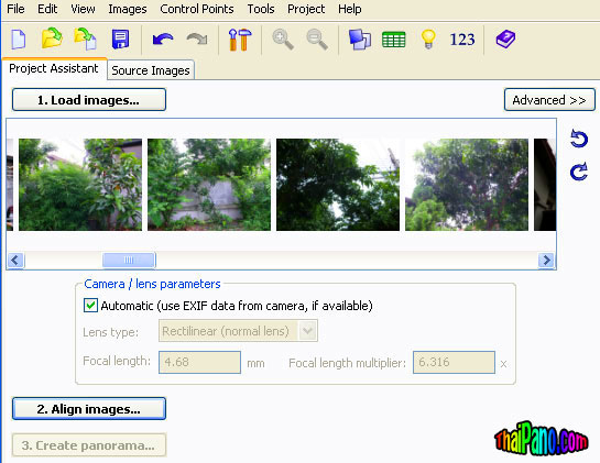 คำตอบที่ 7 ขั้นตอนต่อไปก็เป็นการต่อภาพ แนะนำให้ใช้โปรแกรม ptgui ครับ เพราะทำงานง่ายที่สุด ถ้าภาพถ่ายที่ได้มาสมบูรณ์ คลิ๊กปุ่มเพียงแค่ 3 ครั้ง 1-2-3 ก็เสร็จแล้ว โปรแกรมดาวน์โหลดได้จากอินเตอร์เนตครับ พิมพ์คำว่า ptgui เข้าไปใน google ก็จะเจอ โปรแกรมนี้เวอร์ชั่นทดลองใช้จะได้ภาพที่มีลายน้ำของโลโก้โปรแกรมอยู่ด้วย ส่วนเวอร์ชั่นใช้งานต้องลงทะเบียนและเสียเงิน ส่วนแบบไม่เสียเงินก็มีครับต้องใช้วิชามารหน่อยๆ หาจากใน google นี่แหละ หลังจากดาวน์โหลดโปรแกรมมาแล้ว ติดตั้งโปรแกรมเสร็จ ก็เปิดโปรแกรม เจอปุ่มแรกเลยครับ 1. Load images... คลิ๊กเลือกไฟล์ภาพที่เพิ่งจะถ่ายมา