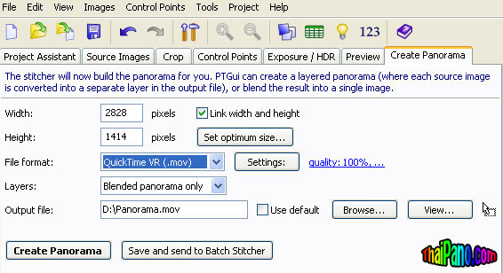 คำตอบที่ 11 ถ้าเราพอใจแล้ว ก็คลิ๊กที่ปุ่ม 3.Create Panorama... แล้วเลือก File format: ให้เป็น QuickTime(.mov) ก็จะได้ไฟล์ภาพ VR Panorama ในรูปแบบ .mov เพื่อใช้ดูด้วยโปรแกรม apple quicktime ตามตัวอย่างนี้ http://thaipano.com/Panorama1/Panorama.mov