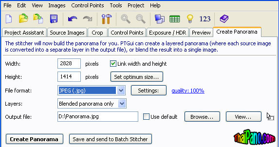 คำตอบที่ 12 หรือเลือก File format: ให้เป็น JPEG (.jpg) จะได้ไฟล์ Panorama.jpg เป็นไฟล์ภาพนิ่ง เพื่อนำมาแสดงด้วยโปรแกรม Panorama Viewer ที่เป็นโปรแกรม Flash ต่อไป เพื่อให้สามารถชมภาพได้เหมือนตามตัวอย่างนี้ http://thaipano.com/Panorama1/