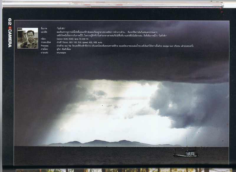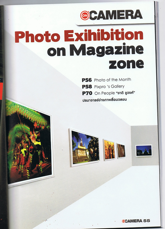 เมื่อสี่ห้าเดือนก่อนผมเคยลองส่งภาพไปร่วมสนุกด้วย...ก็ได้รับการคัดเลือกครับ...ภาพที่ได้รับคัดเลือกจะถูกพิมพ์สี่สีเต็มหน้านิตยสาร on camera พร้อมชื่อและรูปของผู้ถ่าย และมีพื้นที่เล็กๆให้บรรยายขั้นตอนโพรเซสและแนวคิดไว้ในภาพด้วย.....คราวนี้ก็กะว่าจะส่งไปร่วมสนุกอีก...เลยมาชวนเพื่อนๆพี่ๆ ไปร่วมสนุกด้วยกัน...อย่างน้อยก็เป็นการพิสูจน์ว่ามุมมองของเรานั้นเข้าตากะเค้าบ้างหรือเปล่า อย่างน้อยก็เป็นความสุขใจเล็กๆครับ....ได้รับคัดเลือกหรือไม่นั้นไม่ใช่เรื่องใหญ่...ลองไปร่วมสนุกกันดูนะครับ....รายละเอียดก็ตามนี้เลย....อีกนิดหนึ่งอ่านกฎและกติกาให้เข้าใจก่อนด้วยนะครับ...