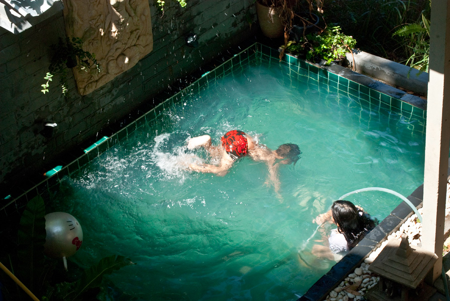ที่สระนี้ไม่มีปลาครับ มีแต่ลูกสองคนที่เล่นอยู่อะครับ ของผมใส่กรองตัวเล็กครับแต่เปิดให้น้ำเวียนทุกวัน ใส่คลอรีน แต่บ่อปลาหน้าบ้านไม่ใส่คลอรีน แต่ใส่เกลือ เติมอากาศ แล้วทำเป็นน้ำตกไหลไว้ แต่บ้านผมไม่มีน้ำประปานะครับมีแต่น้ำบ่อ แต่น้ำใสตลอดครับ