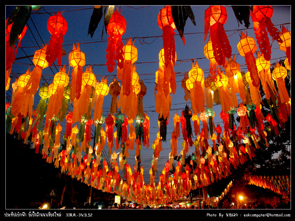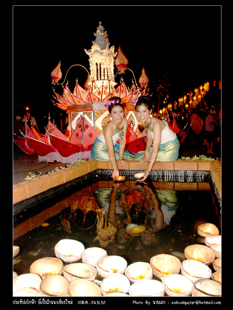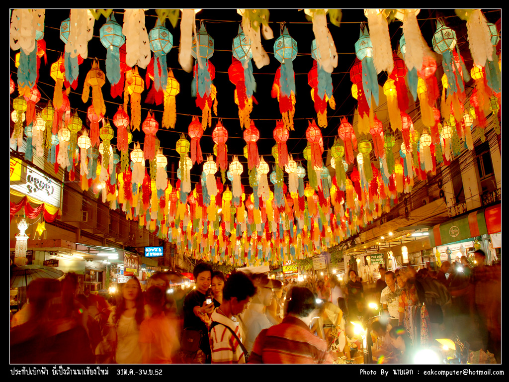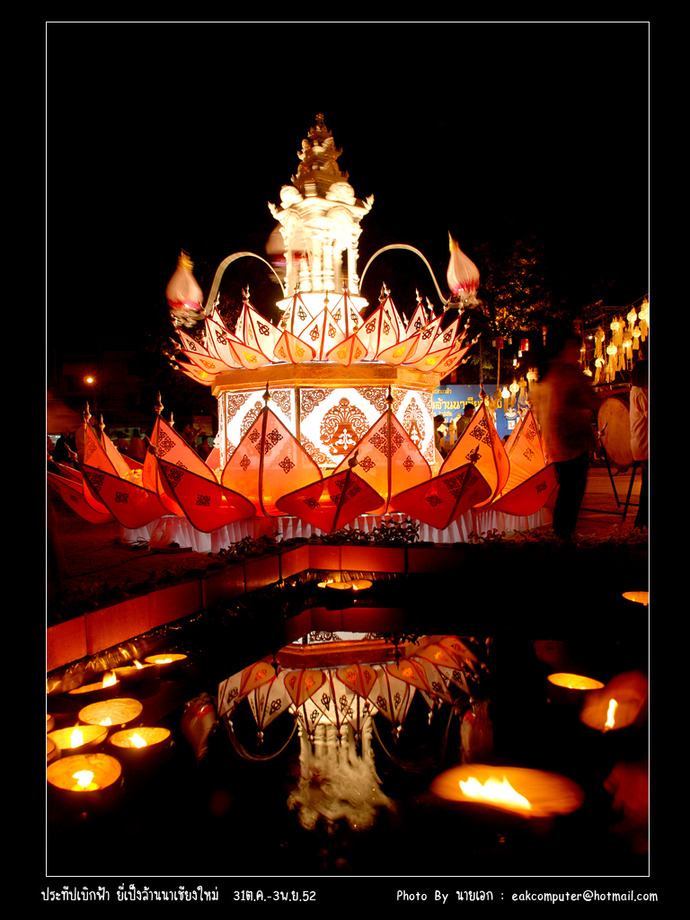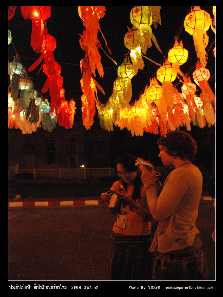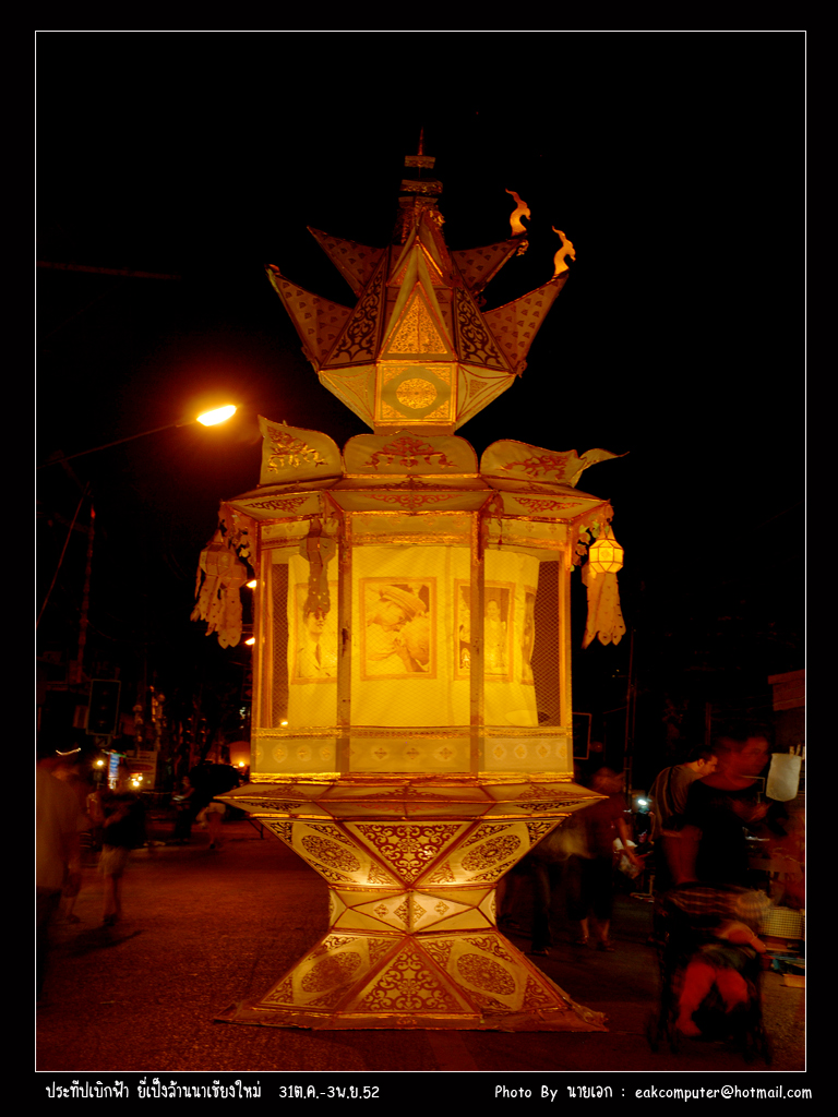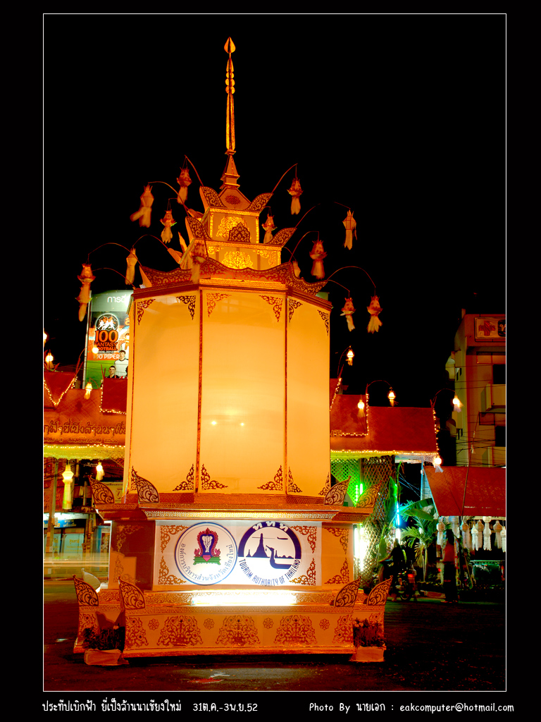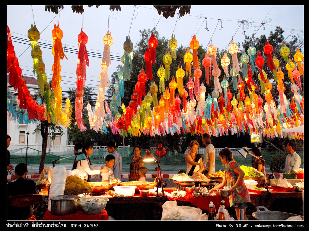 ปีนี้ก็ไม่ทันแล้วครับ คือว่างานจะมีช่วงเทสกาลลอยกระทงของทุกปีนะครับ แต่ปีนี้เป็นปีแรกนะครับ ที่เปิดเป็นถนนวัฒนธรรม คือถนนพระปกเกล้า ครับ ก็จะมีกิจกรรมมากมายครับ ทั้งการทำบุญเสริมดวงชะตา 10 วัด แล้วก็การแสดงมากมาย รวมทั้งซุ้มอาหารเมืองๆที่หาทานกันได้ยาก เช่นข้าวนกงา เอาข้าวนึ่งมาผสมงาแล้วตำๆๆครับ ก็อร่อยดีครับ เค็มๆมันๆ อิอิอิ ก็ยังมีอีกครับที่ชื่อแปลกๆๆจำไม่หมดครับ ก็เที่ยวไปทานไป มีถนนคนเดินด้วยครับ แต่รอปีหน้าแล้วกันนะครับ ผมจะมาแจ้งข่าวให้ทราบนะครับ ผมถ่ายไม่ค่อยสวยเท่าไหร่ครับ ถ้าคุณเอ294 คุณนัน อาจารย์ปู่ คุณไพศาล คุณป้อม มาถ่ายล่ะก็สุดยอดครับ...ผมยอมรับเลยว่ากลางคืนถ่ายยากครับ พอใช้แฟลชแสงก็ไม่สวยครับ ขาวไปหมด ตั้งขาถ่าย ลมก็พัด เอาที่ชัดๆไม่ค่อยมีครับ ก็ขอบคุณครับ ปีหน้าว่ากันใหม่ครับ
