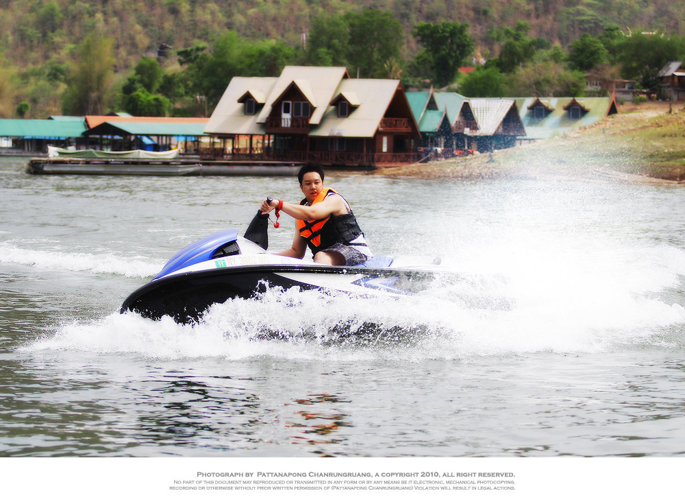 มีโอกาสได้ไปเที่ยวที่รักน้ำรีสอร์ท กาญจนบุรีช่วงหยุดวันแรงงานมาครับ บรรยากาศไม่ค่อยดีเท่าไร่ มีฝน ฟ้าปิด ลมแรง นอนบนแพบ้าน โคลงตลอดกางขาตั้งไม่ได้เลยครับ แต่ความโชคร้ายยังไม่จบ เช่าเจ็ทสกีที่รีสอร์ทมาขับ ออกไปเล่นกันด้านนอก เจ็ทสกีลำที่ผมขับสาดโค้งแรงไปหน่อย เพื่อนที่นั่งมาด้วยหล่นแถมดึงผมลงไปด้วย เจ็ทสกีคว่ำหงายท้อง น้ำเข้า ต้องเปลี่ยนน้ำมันเครื่องและอื่นๆอีกเล็กน้อย หมดไป 1 ชม 4900 ถือว่าเป็นค่าเช่าที่แพงที่สุดเท่าที่ผมเคยขับมาเลยครับ
