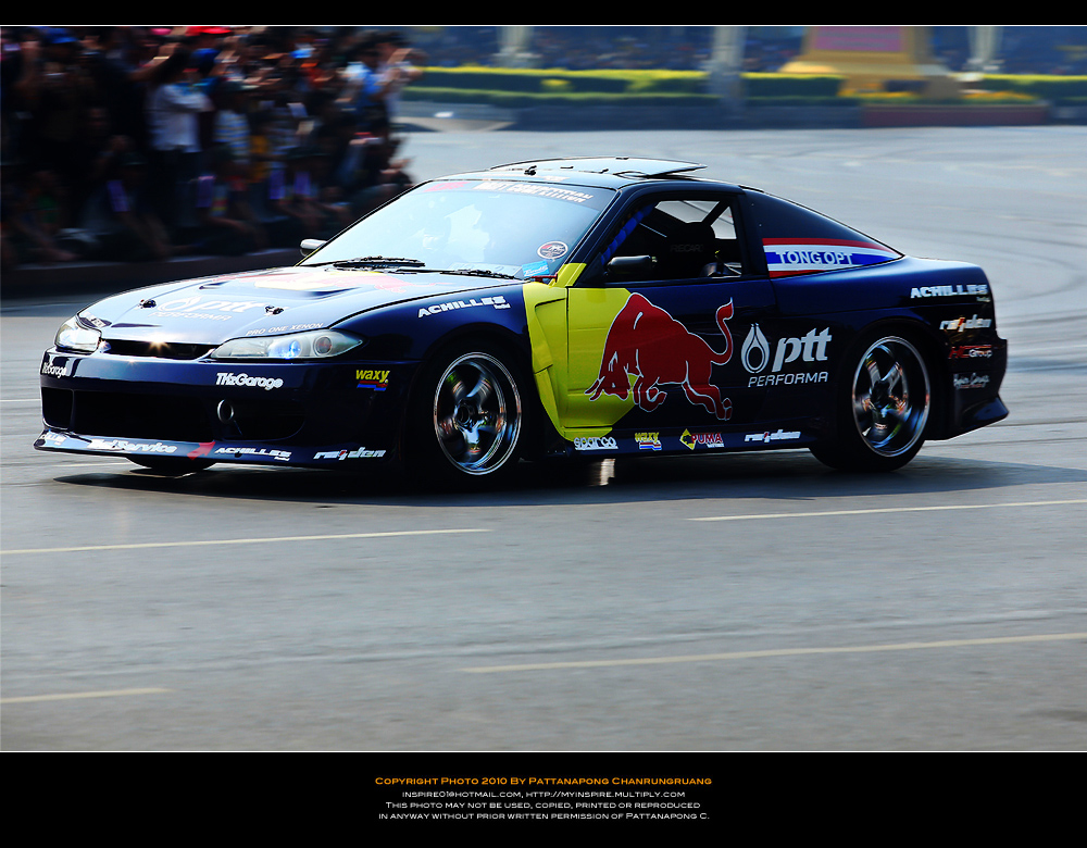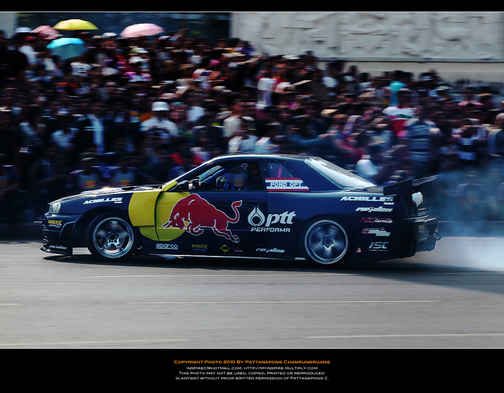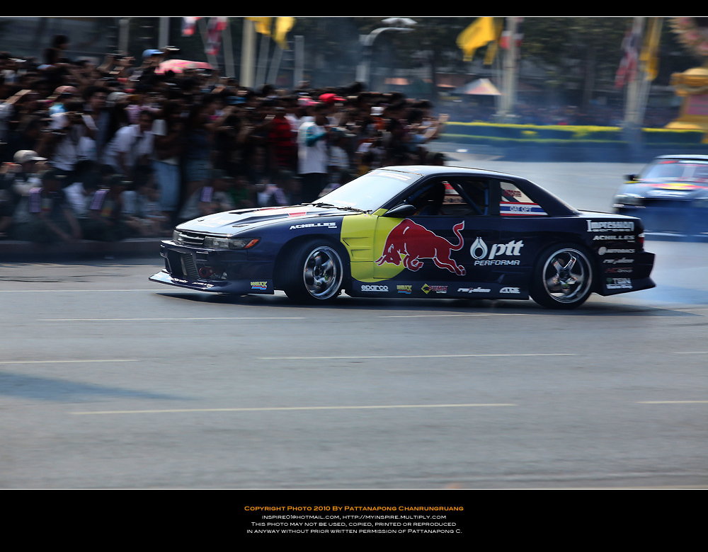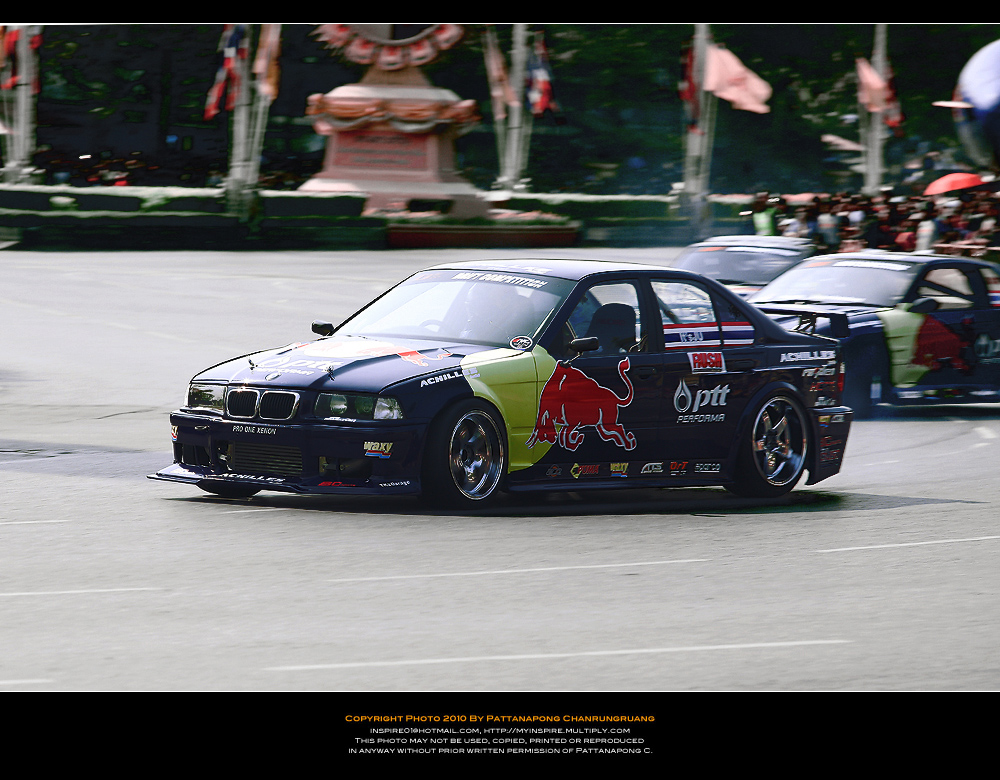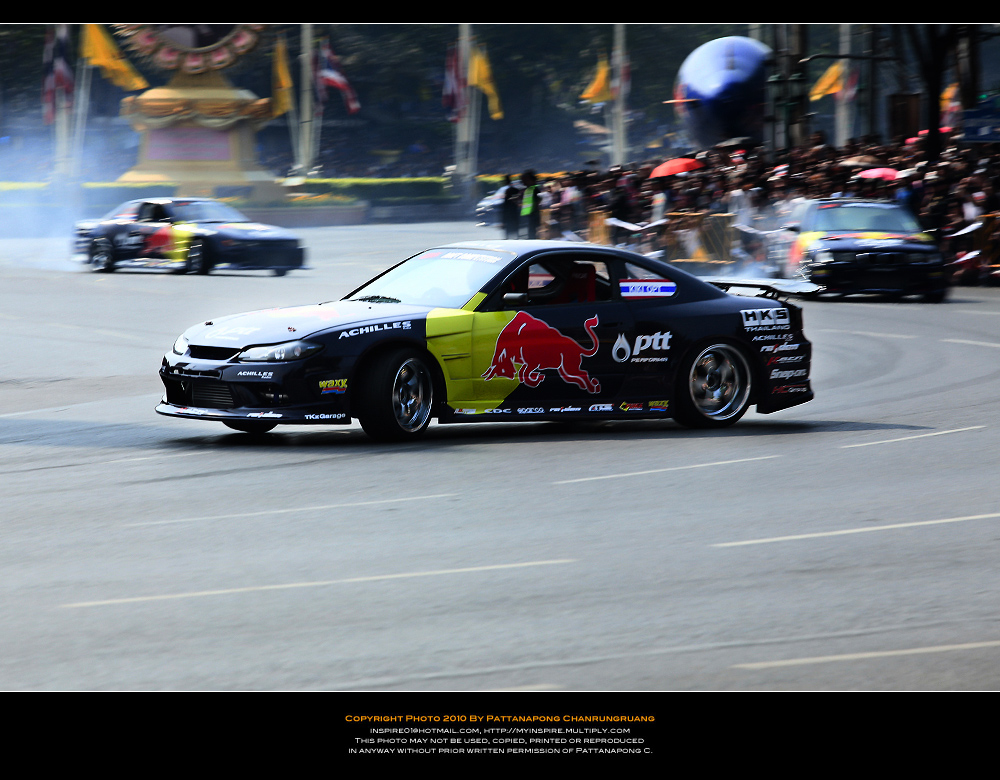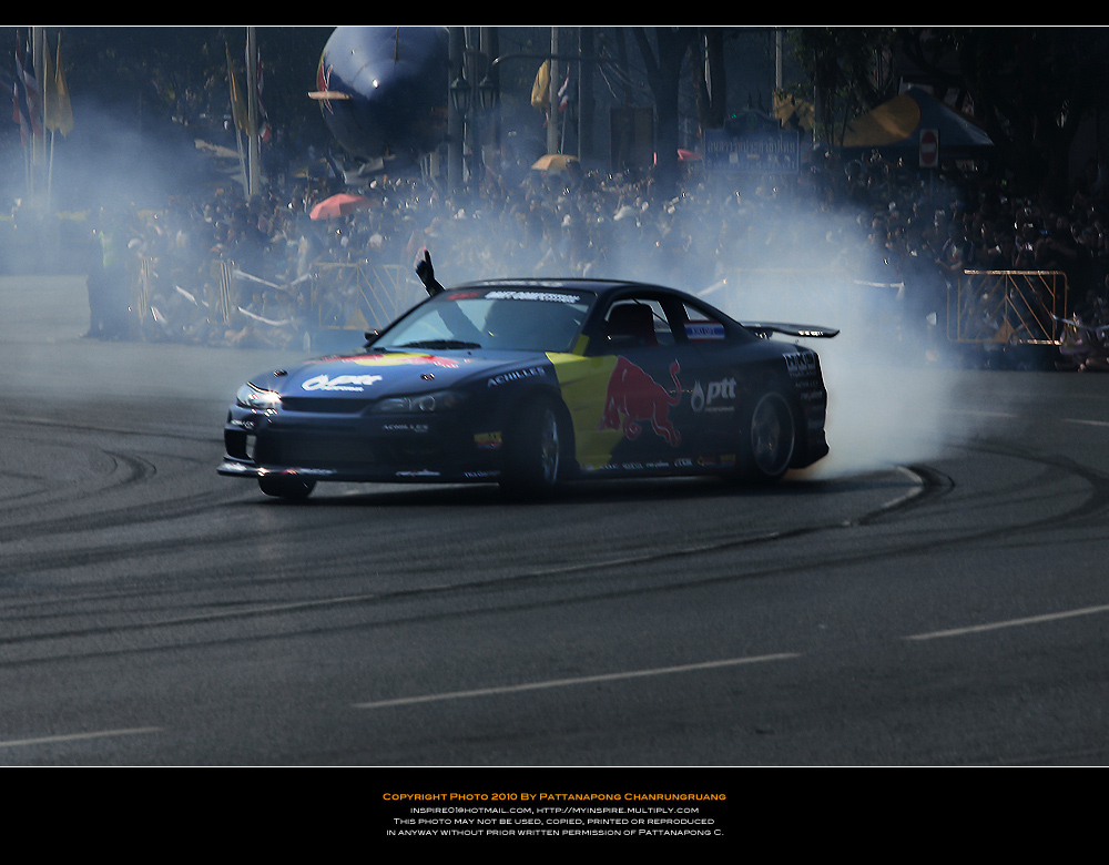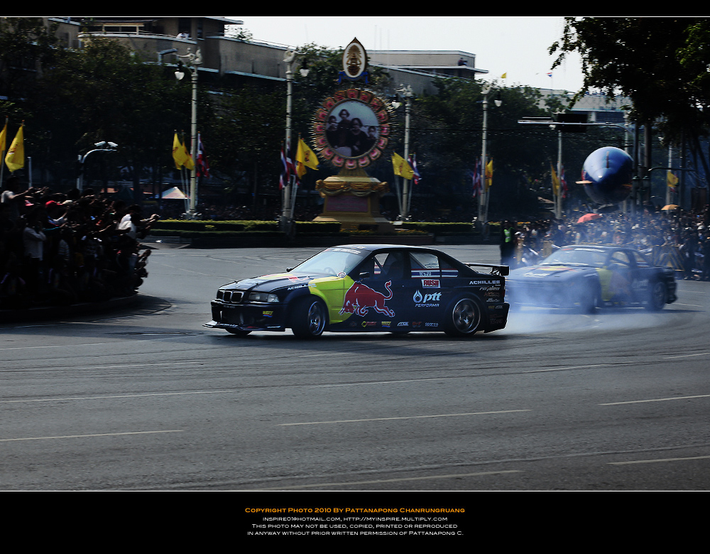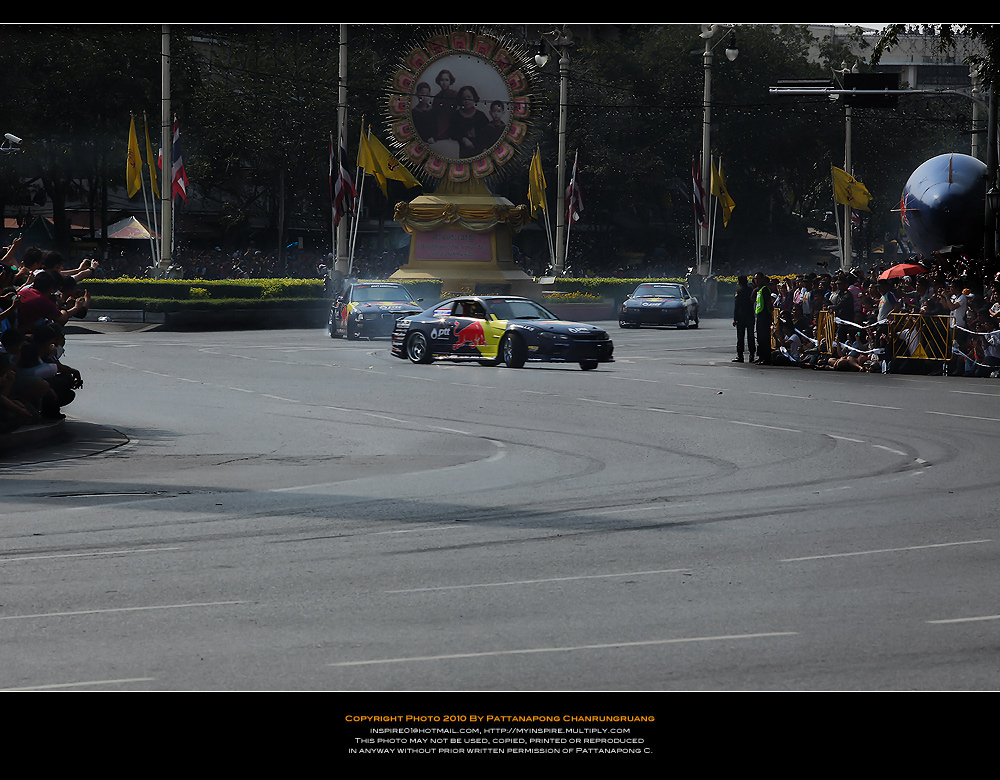 ไปมาครับแต่ไม่ได้อะไรเลยไปถึงแต่เที่ยง(ตอนนนั้นคนน้อยมาก)เลือกทำเลที่คิดว่าดีที่สุดหันหลังให้สี่แยกคอกวัวหันหน้าให้อนุเสาวรีย์ตรงข้ามคุรุสภากะว่าทั้งดริฟทั้งเอฟวันวิ่งเข้ามาหาและก้อผ่านไปเราจะได้ทั้งแพนทั้งสต็อปแอ๊คชั่น...ได้ทั้งวิ่งสวนกลับมาอีกรอบของอีกฝั่งถนนแล้วผมก้อนั่งยิ้มอย่างสบายใจรอเวลาอย่างเดียว..แล้วก้อรอๆจนงานจะเริ่มนั่นแหล่ะรอจนผู้คนแห่แหนกันมามากขึ้นเรื่อยๆจนเจ้าหน้าเทศกิจต้องออกมายืนเป็นกำแพงมนุษย์เพื่อกันไม่ไห้คนดูล้ำเส้นมากเข้าอีกเพราะคนดูทะลักจากฟุตบาทเลยเข้ามายืนเบียดเสียดกันจนเสียไปอีก 1 เลนถนนพอรายการเริ่มเหล่าบรรดาคนดูไม่ได้ดูเฉยๆนี่ครับยืนส่ายไปส่ายมาโยกไปโยกมาตามอารมณ์ของรถแข่งแล้วใครมันจะไปถ่ายได้เล่าครับผมโดนเบียดเป็นปลากระป๋อง(เลยเก็บอุปกรณ์เข้ากระเป๋าและเห็นอีกหลายๆคนก้อทำแบบผม..5555)แค่จะถ่ายให้ทะลุบรรดาเทศกิจที่ยืนเป็นแถวบังอยู่ด้านหน้าสุด(เหมือนจะดูแลประชาชนแต่รถวิ่งพวกยืนถ่ายกันอย่างเมามัน)ก้อไม่มีโอกาสแล้ว..ผมทำใจไว้ตั้งแต่เห็นคนมาแล้ว...คิดซะว่ามารอดูด้วยตาได้ยินเสียงเต็มสองรูหูก้อถือว่าคุ้มค่า...(ผมว่าถ้านั่งบนอัฐจรรศ์ชั้นบนสุดน่าจะมีมุมกล้องได้ดีกว่ายืนบนถนนน่ะครับคุณ KENว่าไหม???)ขอบคุณภาพสวยๆโอกาสดีๆที่ได้ภาพครับคุณ KEN....