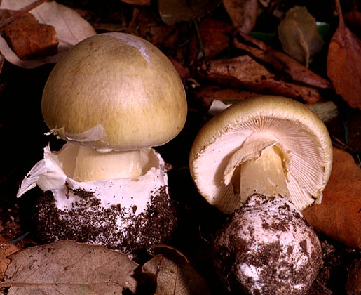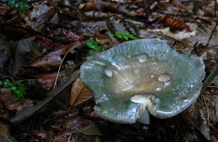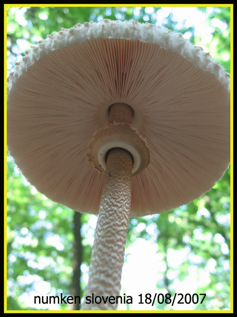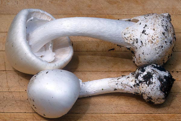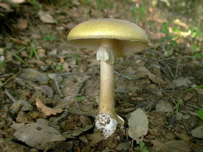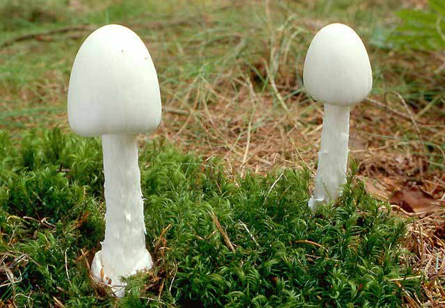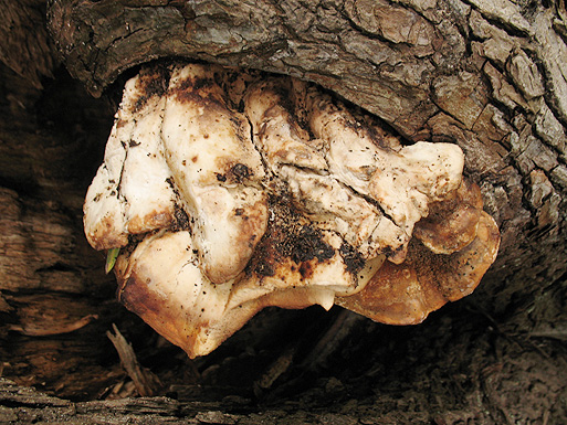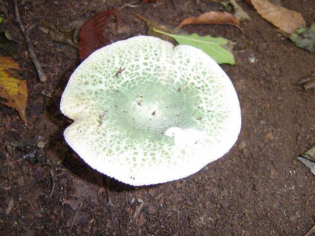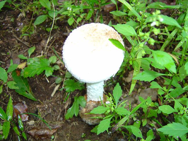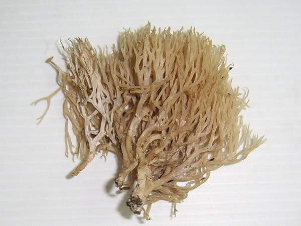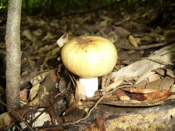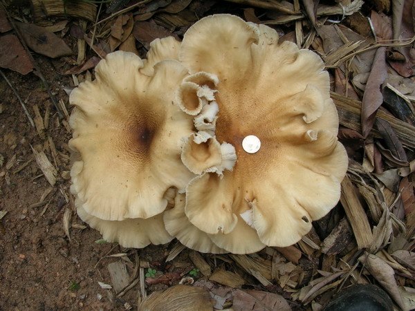 หมวกเห็ดรูปกระทะคว่ำ สีเหลืองอ่อนหรือขาวนวลอมชมพู เส้นผ่านศูนย์กลาง 1.5-10 ซม. ผิวเรียบ กลางหมวกเว้าตื้น ขอบม้วนงอลงและเป็นคลื่น เนื้อสีขาว หนา 1-2 ซม. ด้านล่างมีหนาม ยาว 3-8 มม. เส้นผ่านศูนย์กลาง 1-2 มม. ปลายเรียวเล็ก สีขาวนวล ยาวไม่เท่ากัน ก้านสีขาวหรือขาวอมเหลืองอ่อน ยาว 3-100 ซม. เส้นผ่านศูนย์กลาง 1-3 ซม. ส่วนมากไม่อยู่กึ่งกลางดอก ผิวเรียบ เมื่อฉีกขาดหรือช้ำผิวจะเปลี่ยนเป็นสีน้ำตาลอ่อนอมเหลือง สปอร์ค่อนข้างกลม สีขาว ขนาด 6-7x 7-8 มคม. ผิวเรียบ