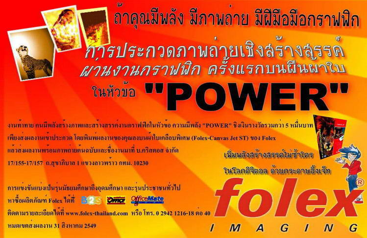 งานท้าทายคนมีพลังสร้างสรรค์ โดยส่งภาพเข้าประกวด ภายใต้แนวคิดของ Folex ที่เน้นความมีพลัง (The Power) ชิงเงินรางวัลรวมมูลค่ากว่า 5 หมื่นบาท