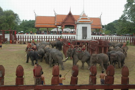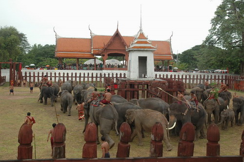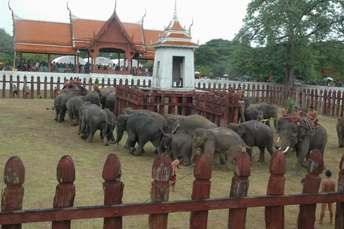 เวลา 15.00 น. วันที่ 18 พ.ค.49 ที่เพนียดคล้องช้าง ต.สวนพริก อ.พระนครศรีอยุธยา จ.พระนครศรีอยุธยา นายสุวัจน์ ลิปตพัลลภ รองนายกรัฐมนตรี นำคณะทูตานุทูตจากประเทศรัสเซีย ชมพิธีคล้องช้างเข้าเพนียด โดยจัดให้นั่งชมในพระที่นั่งเพนียดสำหรับดูการคล้องช้างเถื่อนในเพนียด ซึ่งเป็นหนึ่งในกิจกรรมโครงการ เที่ยวไปชิมไปทั่วไทยรับทูตไทย วัตถุประสงค์เพื่อเผยแพร่อาหารไทย ขนบธรรมเนียมประเพณี ตลอดจนวัฒนธรรมของชายไทยแก่ชาวต่างชาติ โดยเฉพาะจากรัสเซียให้รู้จักประเทศไทยในแง่มุ่มต่าง ๆ มากยิ่งขึ้น ซึ่งนายลายทองเหรียญ มีพันธ์ เจ้าของปางช้างอยุธยา นำช้างกว่า 30 เชือกพร้อมควาญช้างและชายฉกรรจ์จำนวนกว่า 60 คนแต่งกายตามแบบฉบับควาญช้างไทย ออกสาธิตพิธีคล้องช้างตามขั้นตอนที่สมบูรณ์ พบว่าคณะทูตานุทูตจากประเทศรัสเซียให้ความสนใจเป็นอย่างมาก