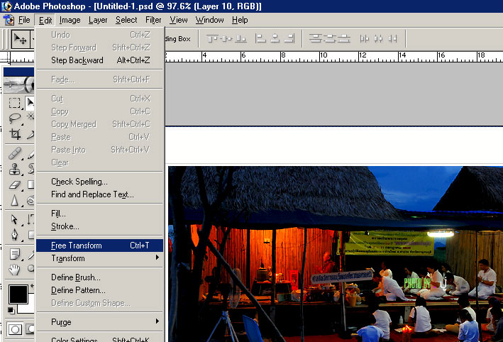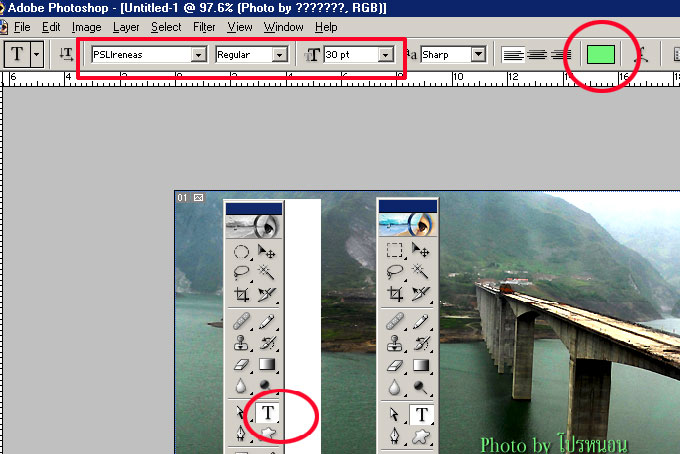 ๕. คลิกเมาส์...ลาก...กลุ่มอักษรในพาเลสเลเยอร์ภาพที่ ๑ .......... ไปวางบนรูป "ภาพที่ ๒ ภาพคัดลอกตัวอักษร" ได้เลย...ครับ...อักษรชุดนี้จะไปด้วยกันทั้งกลุ่ม ทั้งรูปแบบการจัดวางในกลุ่ม ทั้งสไตล์ ... ไปหมดเลยครับ
