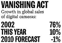 ซึ่งเป็นตัวเลขที่แม้จะมีแนวโน้มลดลง แต่ก็ยังเป็นอัตราการเติบโตที่ดูน่าตื่นเต้นตื่นใจอยู่ อย่างไรก็ตาม การเติบโตได้ลดฮวบลงในปี 2548 ซึ่งสถิติบันทึกว่าตลาดโตเพิ่มขึ้นจากปีก่อนหน้าเพียง 27% และปีนี้ (2549) ก็ได้มีการประมาณการว่ายอดขายกล้องดิจิตอลจะเติบโตขึ้นอีกแค่ 10% เท่านั้น (103.2 ล้านตัวเทียบกับปี 2548 ที่ขาย 93.8 ล้านตัว)