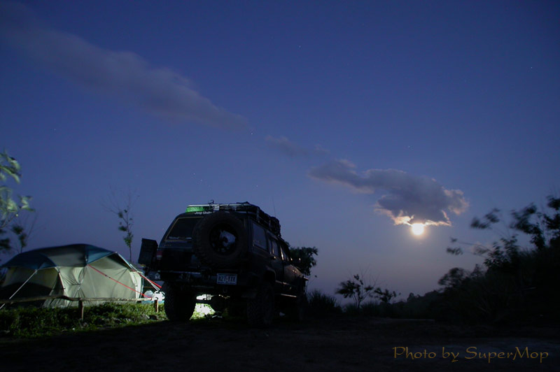 เอาที่ผมชอบนะครับ ชอบฉากหน้าที่เป็นพื้นดินที่มืดไม่สนิทชวนใ้ห้ติดตามเพ่งมองไล่คอนทราส ่ไปหารถที่ค่อยๆสว่างขึ้นเรื่อยๆจากไฟที่อยู่ตรงหน้ารถ โดยมีแนวรั้วไม้นำสายตาเข้าไปหาแสงไฟ ค่อยๆไปมองเห็นเด่นชัดที่หน้าเต้นท์ เชือกสีแดงแม้จะเส้นเล็กๆ แต่ทำให้ภาพสดใสในยามเช้า นำไปโยงกับหลังคาเต๊นท์สีน้ำเงิน กลมกลืนรับกับสีของท้องฟ้า ซึ่งถ่วงน้ำหนักของเต้นท์ด้านซ้ายไว้ด้วยดวงอาทิตย์ยามรุ่งอรุณทางด้านขวา พระเอกคือก้อนเมฆที่ทอดลงมาตั้งแต่ขอบภาพบนซ้ายมาเสริมพลังน้ำหนักให้ดวงอาทิตย์มีขนาดใกล้เคียงกับเต้นท์
