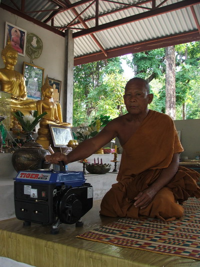 พระคุณเจ้า ท่านรับเครื่องปั่นไฟ ที่คุณต้อมให้บรจิจาคเป็นทาน เพื่อใช้ประโยชน์ในกิจกรรม ภายในสำนักสงฆ์ ครับ