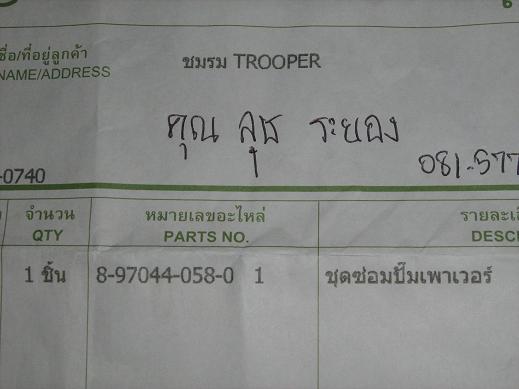 วันก่อนได้ก้มดูใต้เครื่องรถเห็นมีน้ำมันเยิ้มแถวๆ ปั้มเพาเวอร์เลยตัดสินใจเปิดฝากระโปรงรถดูที่กระปุกน้ำมันเพาเวอร์ โอ้แม้เจ้า. ปรากฏว่าน้ำมันมันหายไปครึ่งหนึ่งครับ เพื่อความชัวร์เลยรีบทำความสะอาดที่มีรอยน้ำมันเยิ้มให้สะอาดทิ้งไว้สัก 2 วัน แล้วก้มดูอีกที ชัวร์ครับชุดซ่อมปั้มมันรั่วครับ โทรเช็คราคากับศูนย์อีซูซุระยองราคา1,480 บาท แต่ของต้องรอ 2 วัน เลยตัดสินใจโทรสั่งซื้อที่ จี.พี.อะไหล่ยนต์ทางโทรศัพท์ทางร้านบริการสุดประทับใจเลยครับเขารีบส่งอะไหล่ทางรถทัวร์ให้เลยครับ สั่งตอนเช้าตอนเย็นได้ของเลยครับ