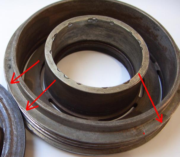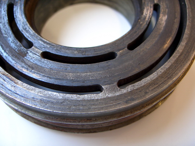 ขอบร่องสายพานตรงจานพูเลย์ก็เบี้ยว ซึ่งเป็นชุดที่เคยไปเก็บมาเปลี่ยนในครั้งแรก เป็นอีกเหตุผลหนึ่งที่ต้องซื้อทั้งลูกมาเปลี่ยนในครั้งนี้