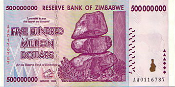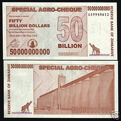 ธนาคารกลางซิมบับเวเปิดตัวธนบัตรใหม่ทางหนังสือพิมพ์" เฮอรัลด์" ฉบับเมื่อวันจันทร์ โดยให้เหตุผลว่า เพื่อความสะดวกของผู้บริโภค เป็นธนบัตรราคาใบละ 2 หมื่นล้าน กับ 5 หมื่นล้านดอลลาร์ซิมบับเว แต่แม้แต่ธนบัตรราคา 5 หมื่นล้าน ก็ยังมีมูลค่าในตลาดมืดเมื่อวันจันทร์เพียง 1.25 ดอลลาร์สหรัฐฯ (ประมาณ 44 บาท) ใช้ซื้อหนังสือพิมพ์"เฮอรัลด์"ได้เพียงสามฉบับ ขณะที่ระบบเศรษฐกิจของประเทศยังมีปัญหาเงินเฟ้ออย่างรุนแรง เมื่อหนึ่งสัปดาห์ก่อน เงิน 5 หมื่นล้านดอลลาร์ฯยังมีมูลค่า 2.20 ดอลลาร์สหรัฐฯ (ประมาณ 77 บาท)และเมื่อสองสัปดาห์ก่อนมีมูลค่า 3.30 ดอลลาร์ (ประมาณ 115 บาท)