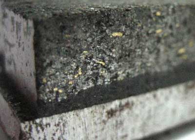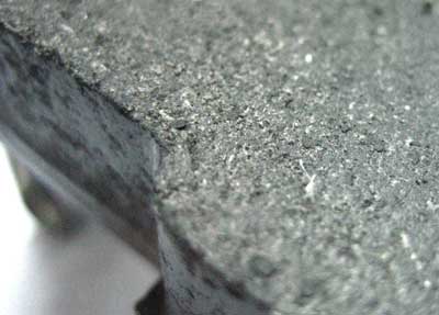 ผ้าเบรคจะมีเนื้อโลหะชิ้นใหญ่ฝังอยู่ในเนื้อผ้าเบรค เนื่องจาก