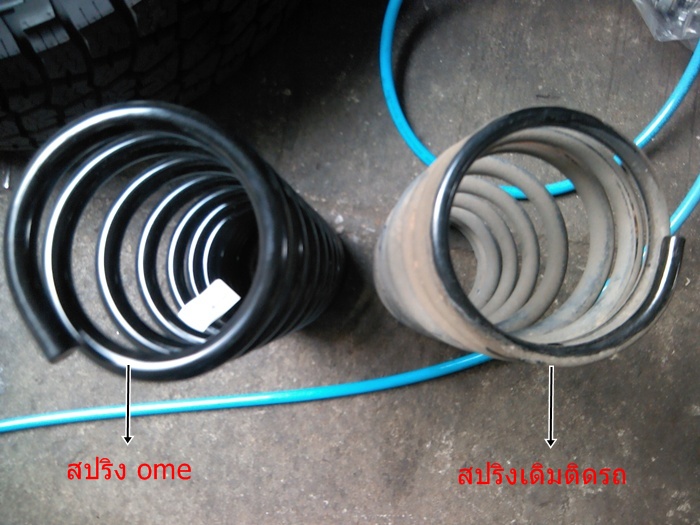 ขณะถอดสปริงเดิมออกจากรถ และเทียบความสูงของสปริงที่ใส่ไปใหม่และสปริงเดิมติดรถครับ ปรากฎว่าความสูงขณะเท่ากัน ... แต่ลองสังเกตขนาดของขดสปริงนะครับ จะเห็นว่ามีขนาดที่ต่างกันโดยสปริงเดิมติดรถนั้นมีขนาดเล็กกว่า สปริง old man พอสมควร