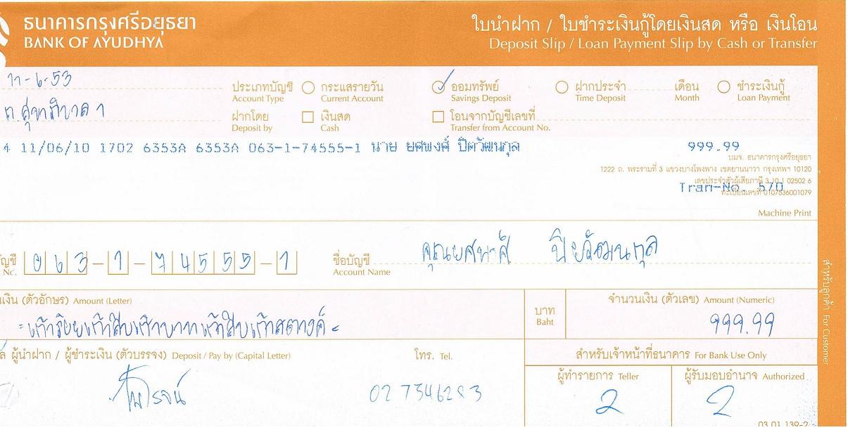 โอนเงินให้เรียบร้อยแล้วครับ บัญชีธนาคารกรุงศรีอยุธยา สาขาสำโรง ออมทรัพย์เลขที่ 063-1-74555-1 นายยศพงศ์ ปีตวัฒนกุล จำนวน 1,009.99 บาท ผ่านทางระบบ ibanking ธนาคารกรุงเทพ (ขอก๊อฟปี้จากพี่ประวิทย์มาด้วยเช่นกันครับ)